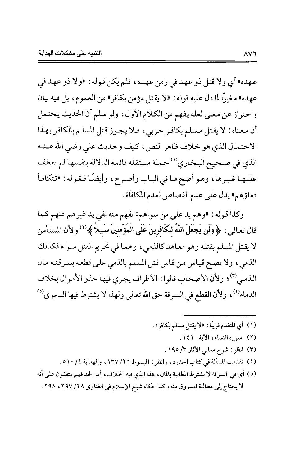 وكذا قوله: "وهم يد على من سواهم" يفهم منه نفي يد غيرهم عنهم كما قال تعالى: {ولن يجعل الله للكافرين على المؤمنين سبيلاً} ولأن المستأمن لا يقتل المسلم بقتله وهو معاهد كالذمي، وهما في تحريم القتل سواء فكذلك الذمي، ولا يصح قياس من قاس قتل المسلم بالذمي على قطعه بسرقته مال الذمي؛ ولأن الأصحاب قالوا: الأطراف يجري فيها حذو الأموال بخلاف الدماء، ولأن القطع في السرقة حق الله تعالى ولهذا لا يشترط فيها الدعوى