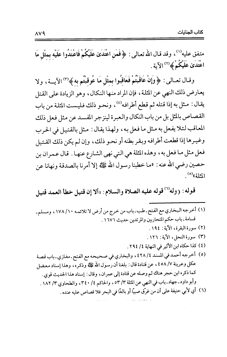 وقال تعالى: {وإن عاقبتم فعاقبوا بمثل ما عوقبتم به} الآية، ولا يعارض ذلك النهي عن المثلة، فإن المراد منها النكال، وهو الزيادة على القتل يقال: مثل به إذا قتله ثم قطع أطرافه، ونحو ذلك فليست المثلة من باب القصاص بالمثل بل من باب النكار والعبرة لينزجر المفسد عن مثل فعل ذلك المعاقب لئلا يفعل به مثل ما فعل به، ولهذا يقال: مثل بالقتيل في الحرب وغيرها إذا قطعت أطرافه وبقر بطنه أو نحو ذلك، وإن لم يكن ذلك القتيل فعل مثل ما فعل به، وهذه المثلة هي التي نهى الشارع عنها. قال عمران بن حصين -رضي الله عنه-: "ما خطبنا رسول الله -صلى الله عليه وسلم- إلا أمرنا بالصدقة ونهانا عن المثلة".