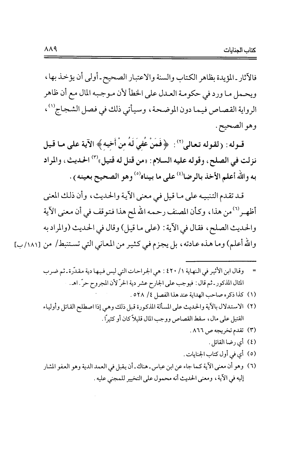 فالآثار -المؤيدة بظاهر الكتاب والسنة والاعتبار الصحيح- أولى أن يؤخذ بها، ويحمل ما ورد في حكومة العدل على الخطأ لأن موجبه المال مع أن ظاهر الرواية القصاص فيما دون الموضحة، وسيأتي ذلك في فصل الشجاج، وهو الصحيح.