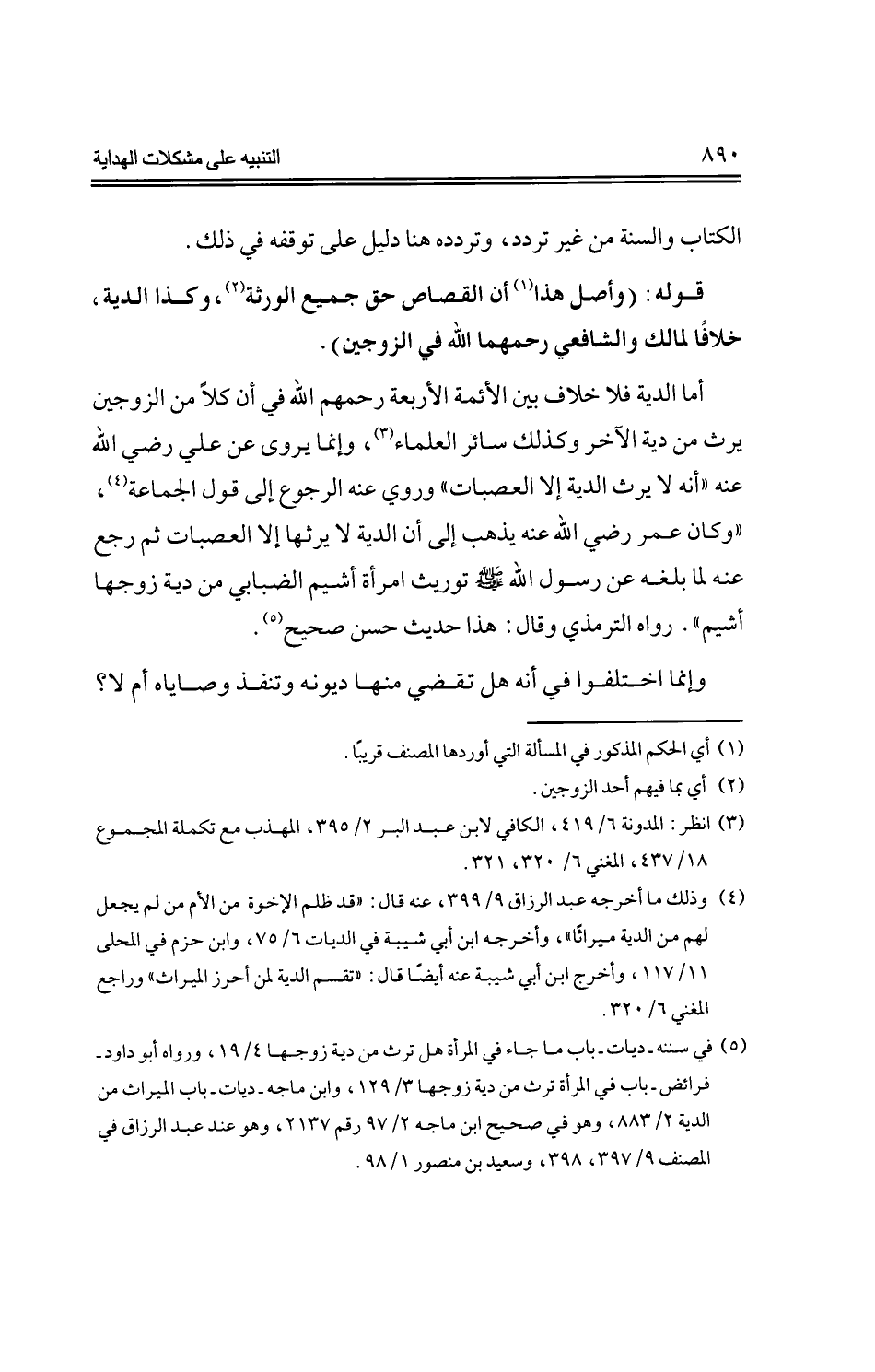 أما الدية فلا خلاف بين الأئمة الأربعة رحمهم الله في أن كلاً من الزوجين يرث من دية الآخر وكذلك سائر العلماء، وإنما يروى عن علي -رضي الله عنه- "أنه لا يرث الدية إلا العصبات" وروي عنه الرجوع إلى قول الجماعة، "وكان عمر -رضي الله عنه- يذهب إلى أن الدية لا يرثها إلا العصبات ثم رجع عنه لما بلغه عن رسول الله -صلى الله عليه وسلم- توريث امرأة أشيم الضبابي من دية زوجها أشيم". رواه الترمذي وقال: هذا حديث حسن صحيح.