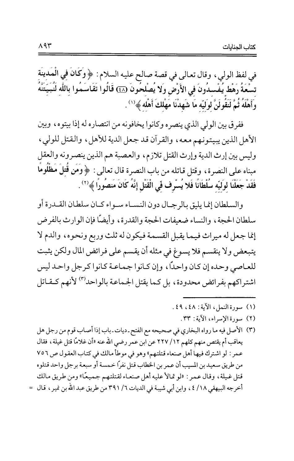 ففرق بين الولي الذي ينصره وكانوا يخافونه من انتصاره له إذا بيتوه، وبين الأهل الذي يبيتونهم معه، والقرآن قد جعل الدية للأهل، والقتل للولي، وليس بين إرث الدية وإثر القتل تلازم، والعصبة هم الذين ينصرونه والعقل مبناه على النصرة، وقتل قاتله من باب النصرة قال تعالى: {ومن قتل مظلومًا فقد جعلنا لوليه سلطانًا فلا يسرف في القتل إنه كان منصورًا}.