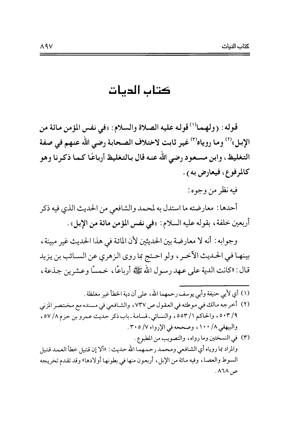 قوله: (ولهما قوله عليه الصلاة والسلام: "في نفس المؤمن مائة من الإبل" وما روياه غير ثابت لاختلاف الصحابة -رضي الله عنهم- في صفة التغليظ، وابن مسعود -رضي الله عنه- قال بالتغليظ أرباعًا كما ذكرنا وهو كالمرفوع، فيعارض به).