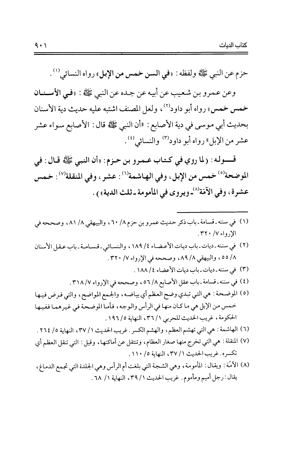 قوله: (لما روي عن كتاب عمرو بن حزم: "أن النبي -صلى الله عليه وسلم- قال: في الموضحة خمس من الإبل، وفي الهاشمة: عشر، وفي المنقلة: خمس عشرة، وفي الآمة -ويرى في المأمومة- ثلث الدية").