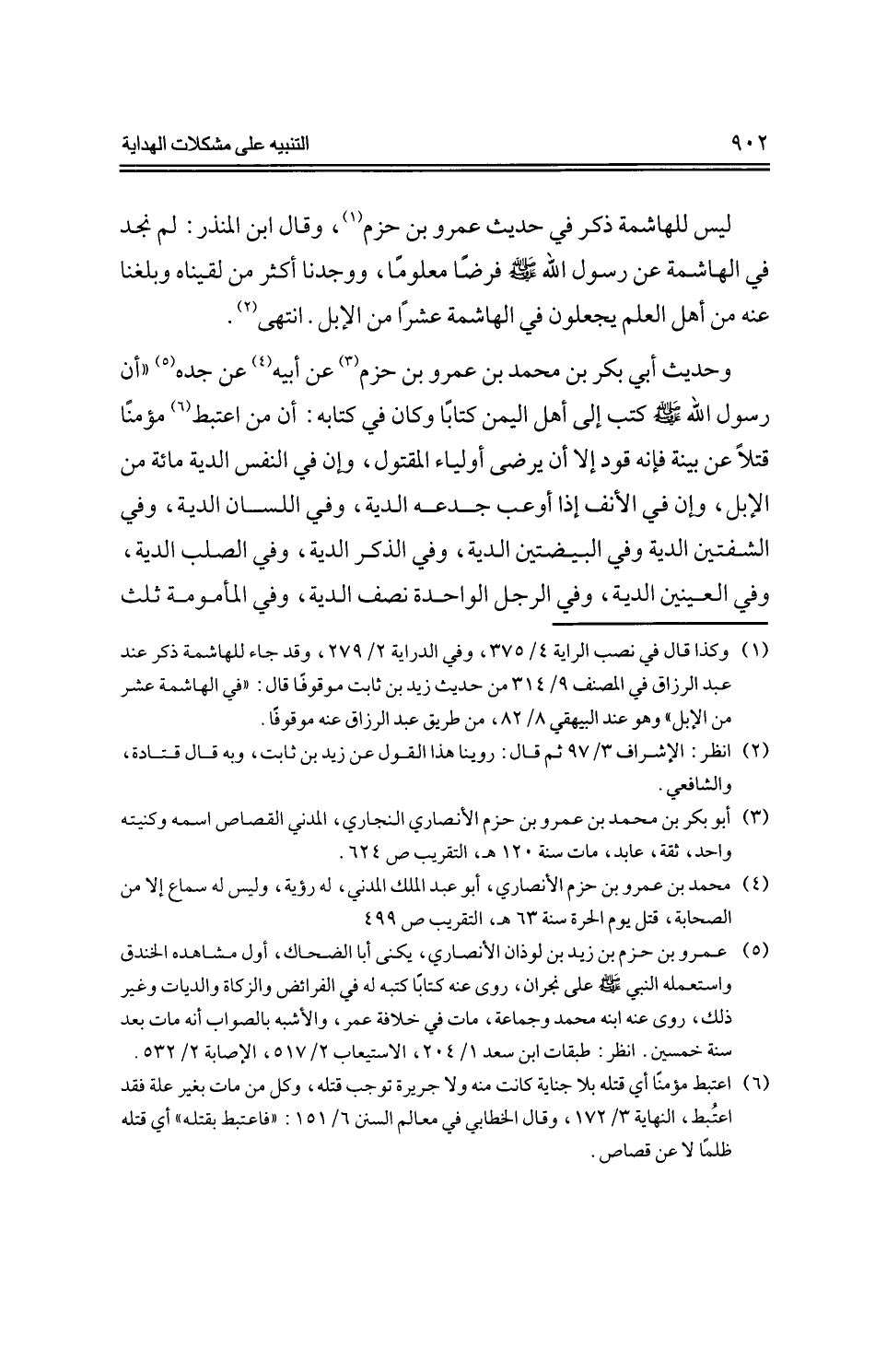 ليس للهاشمة ذكر في حديث عمرو بن حزم، وقال ابن المنذر: لم نجد في الهاشمة عن رسول الله -صلى الله عليه وسلم- فرضًا معلومًا، ووجدنا أكثر من لقيناه وبلغنا عنه من أهل العلم يجعلون في الهاشمة عشرًا من الإبل. انتهى.