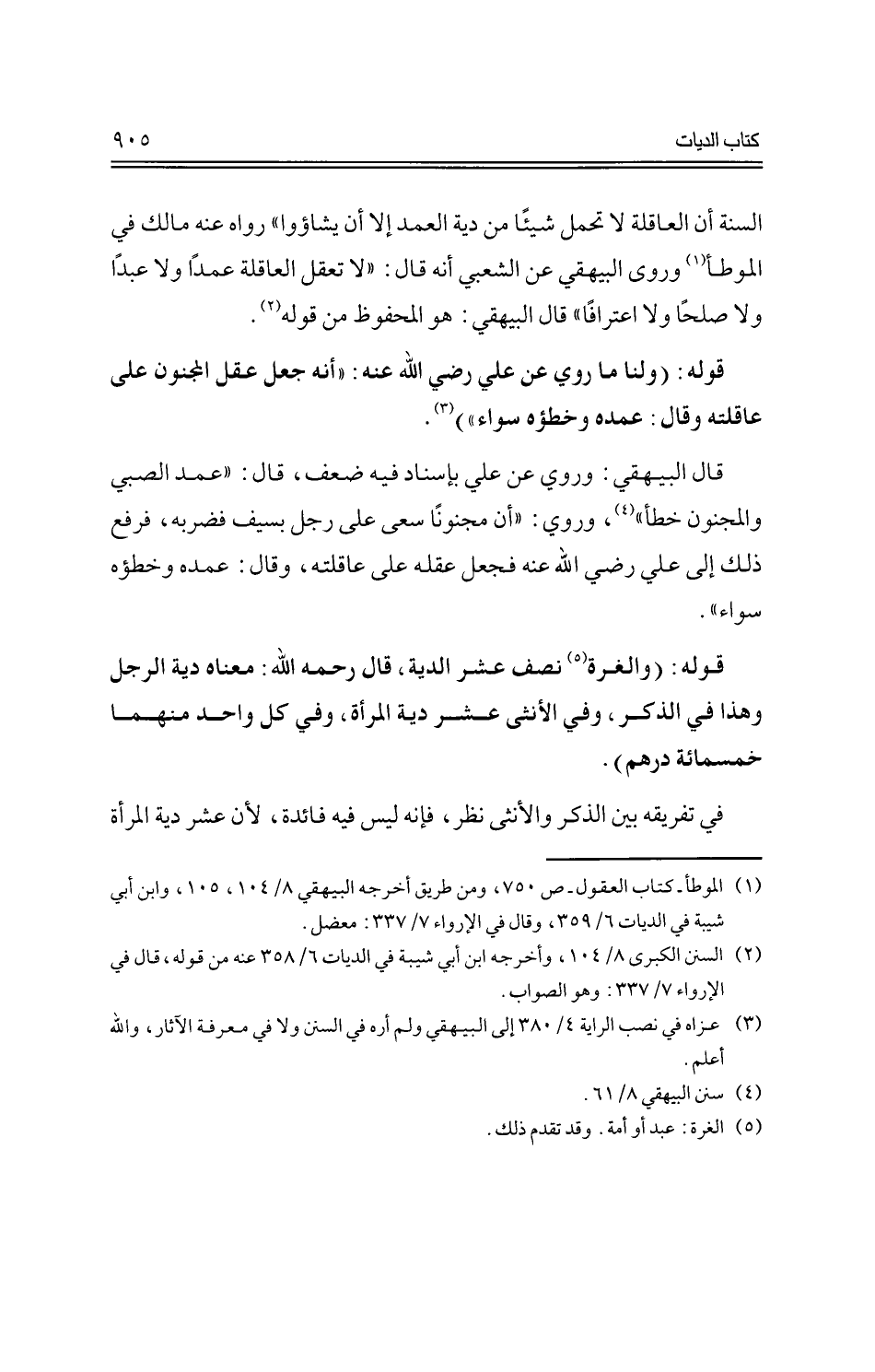 قال البيهقي: وروي عن علي بإسناد فيه ضعف، قال: "عمد الصبي والمجنون خطا"، وروي "أن مجنونًا سعى على رجل بسيف فضربه، فرفع ذلك إلى علي -رضي الله عنه- فجعل عقله على عاقلته، وقال: عمده وخطؤه سواء".