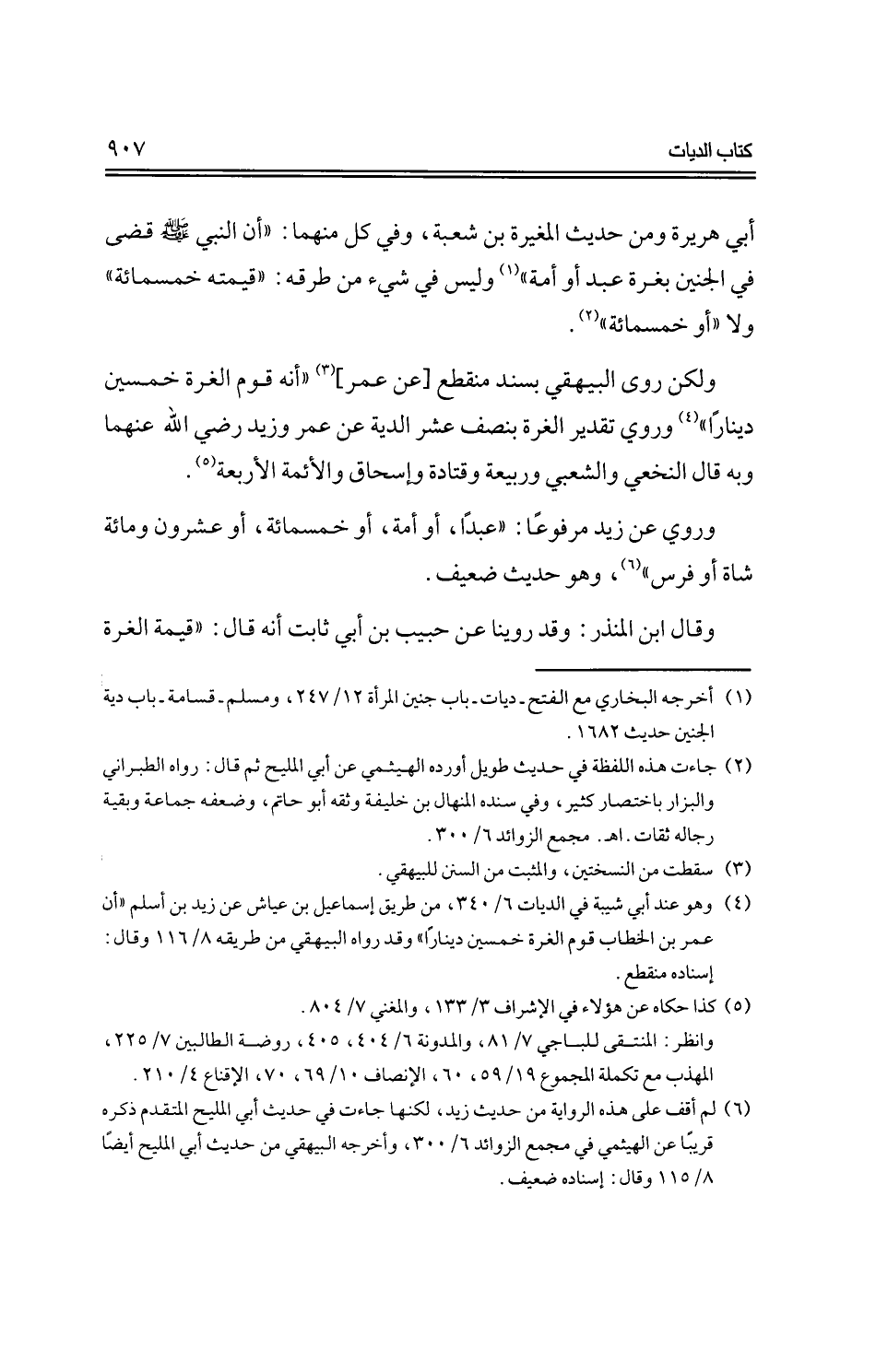 أبي هريرة ومن حديث المغيرة بن شعبة، وفي كل منهما: "أن النبي -صلى الله عليه وسلم- قضى في الجنين بغرة عبد أو أمة" وليس في شيء من طرقه: "قيمته خمسمائة" ولا "أو خمسمائة".