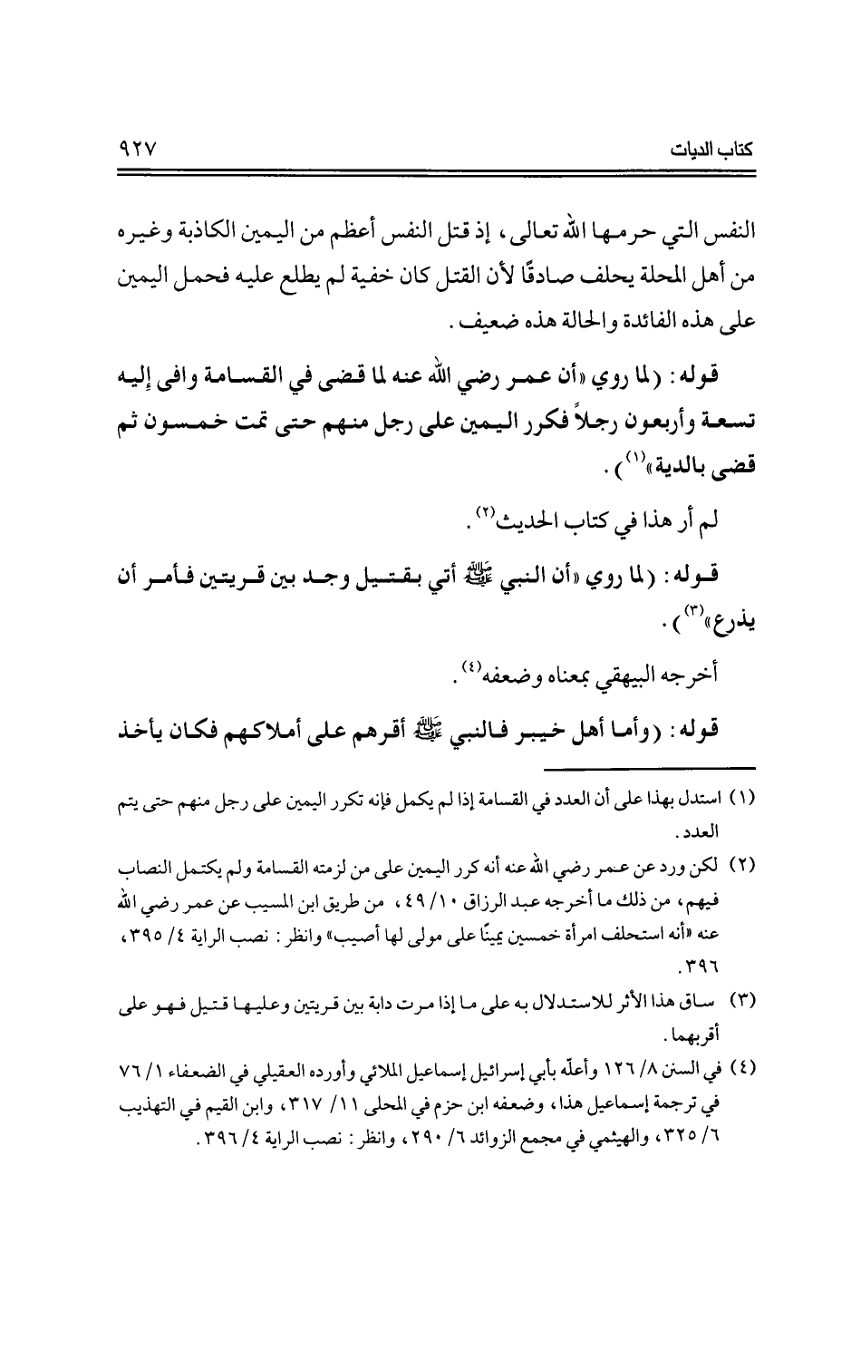 قوله: (لما روي "أن عمر -رضي الله عنه- لما قضى في القسامة وافى إليه تسعة وأربعون رجلاً فكرر اليمين على رجل منهم حتى تمت خمسون ثم قضى بالدية").