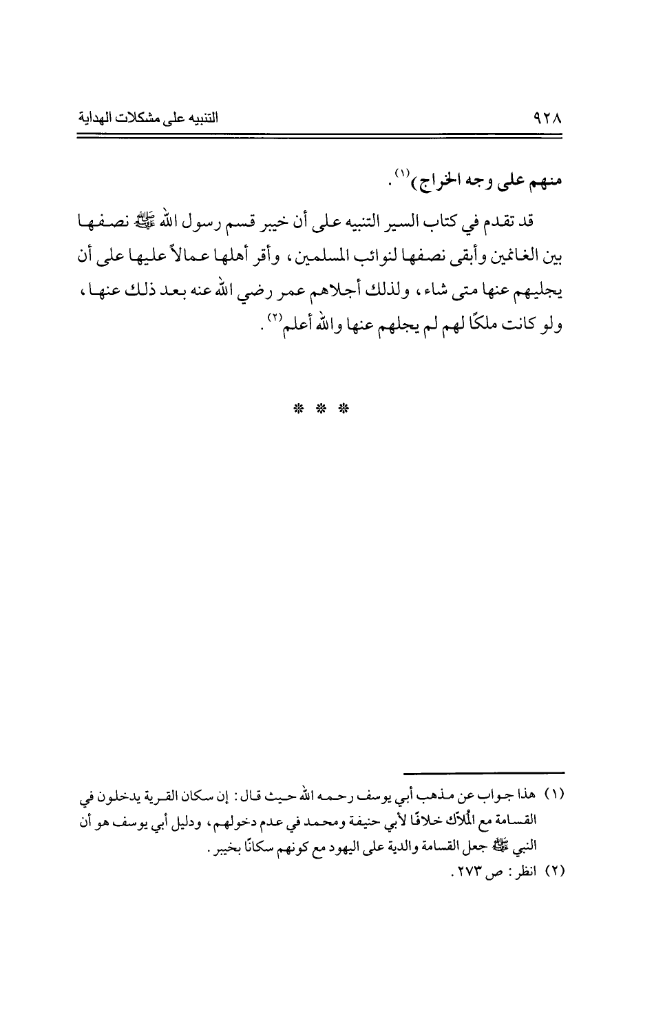قد تقدم في كتاب السير التنبيه على أن خيبر قسم رسول الله -صلى لله عليه وسلم- نصفها بين الغانمين وأبقى نصفها لنوائب المسلمين، وأقر أهلها عمالاً عليها على أن يجليهم عنها متى شاء، ولذلك أجلاهم عمر -رضي الله عنه- بعد ذلك عنها، ولو كانت ملكًا لهم لم يجلهم عنها والله أعلم.