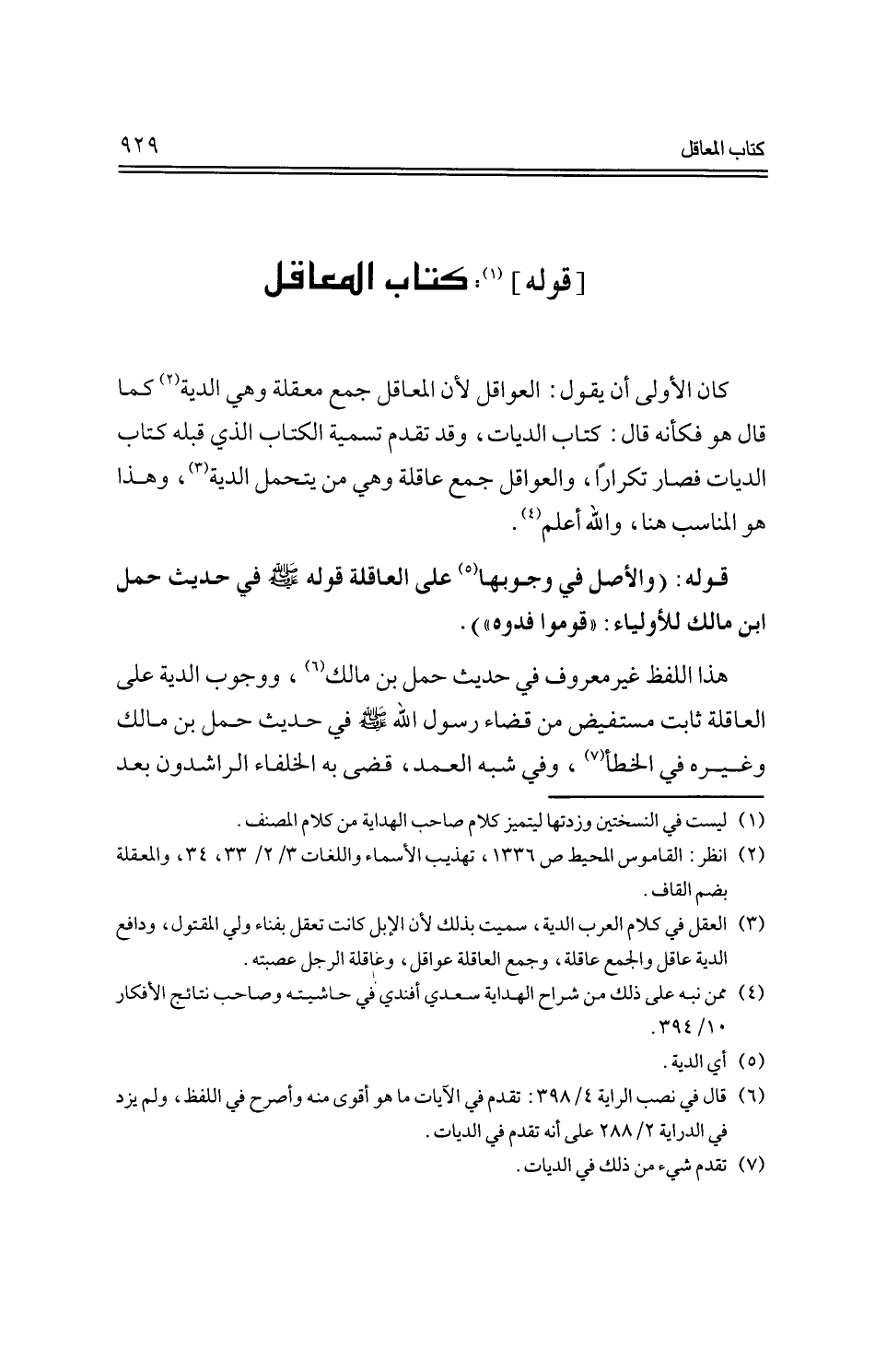كان الأولى أن يقول: العواقل لأن المعاقل جمع معقلة وهي الدية كما قال هو فكأنه قال: كتاب الديات، وقد تقدم تسمية الكتاب الذي قبله كتاب الديات فصار تكرارًا، والعواقل جمع عاقلة وهي من يتحمل الدية، وهذا هو المناسب هنا، والله أعلم.