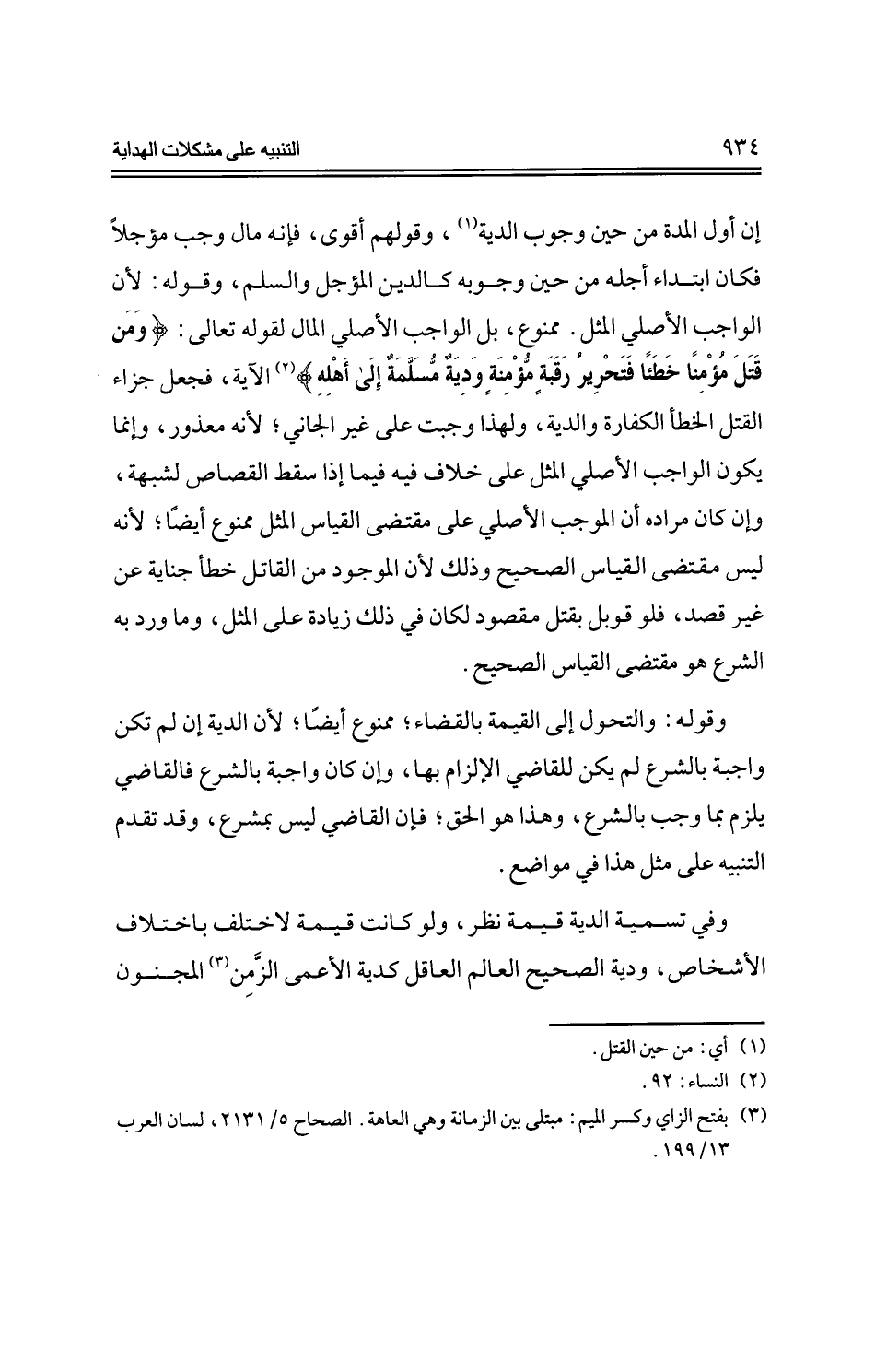 وقوله: والتحول إلى القيمة بالقضاء؛ ممنوع أيضًا؛ لأن الدية إن لم تكن واجبة بالشرع لم يكن للقاضي الإلزام بها، وإن كان واجبة بالشرع فالقاضي يلزم بما وجب بالشرع، وهذا هو الحق؛ فإن القاضي ليس بمشرع، وقد تقدم التنبيه على مثل هذا في مواضع.