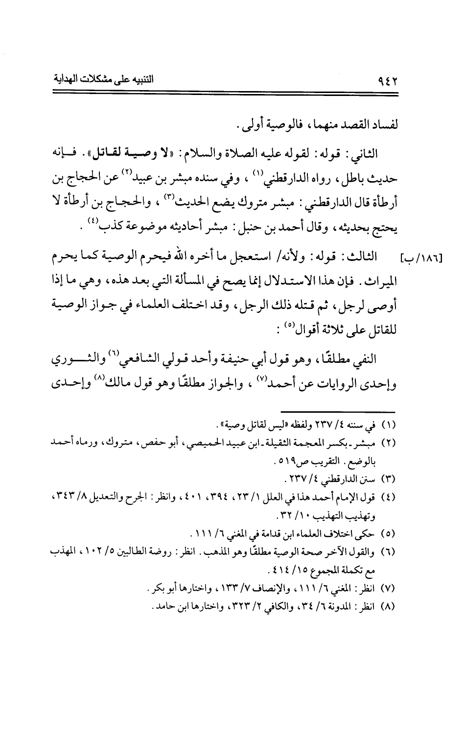 الثاني: قوله: لقوله عليه الصلاة والسلام: "لا وصية لقاتل". فإنه حديث باطل، رواه الدارقطني، وفي سنده مبشر بن عبيد عن الحجاج بن أرطأة قال الدارقطني: مبشر متروك يضع الحديث، والحجاج بن أرطأة لا يحتج بحديثه، وقال أحمد بن حنبل: مبشر أحاديثه موضوعة كذب.