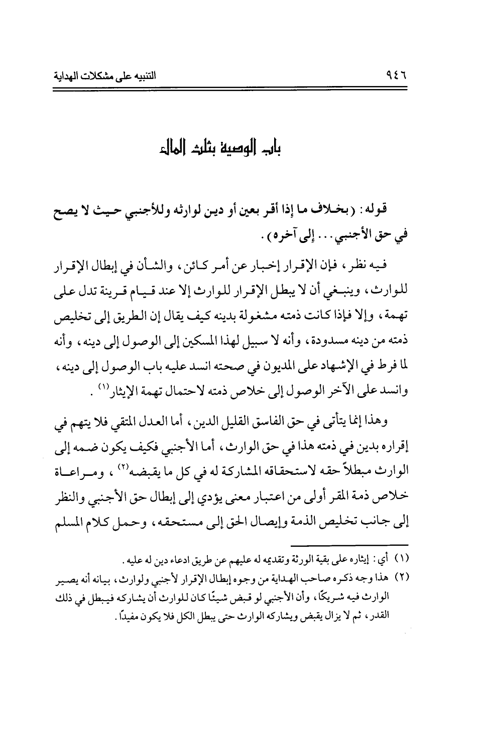وهذا إنما يتأتى في حق الفاسق القليل الدين، أما العد المتقي فلا يتهم في إقراره بدين في ذمته هذا في حق الوارث، أما الأجنبي فكيف يكون ضمه إلى الوارث مبطلاً حقه لاستحقاقه المشاركة له في كل ما يقبضه، ومراعاة خلاص ذمة المقر أولى من اعتبار معنى يؤدي إلى إبطال حق الأجنبي والنظر إلى جانب تخليص الذمة وإيصال الحق إلى مستحقه، وحمل كلام المسلم