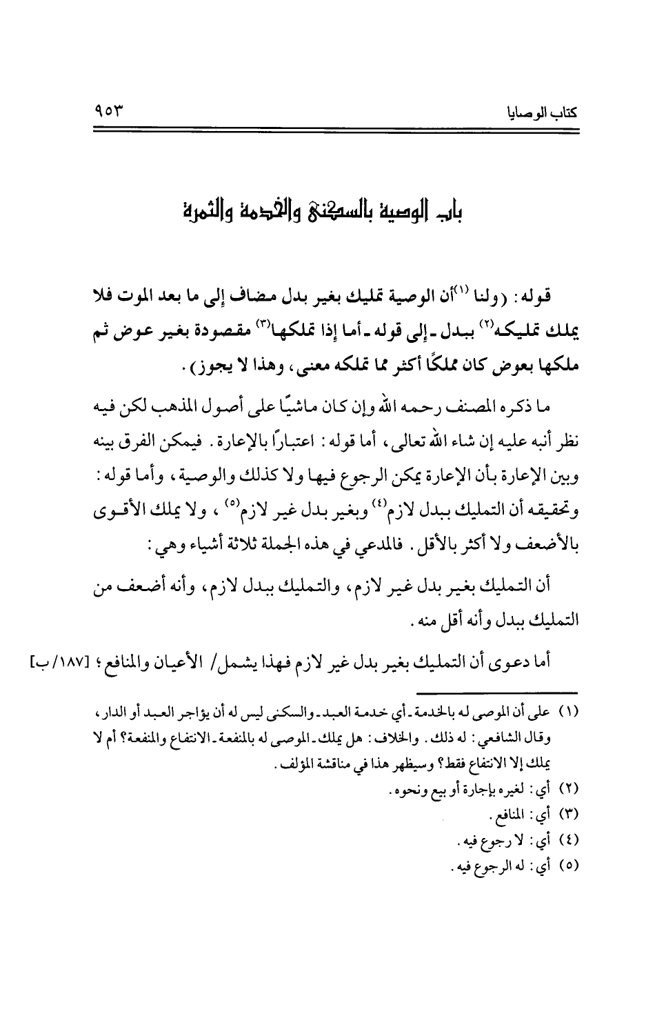 ما ذكره المصنف رحمه الله وإن كان ماشيًا على أصول المذهب لكن فيه نظر أنبه عليه إن شاء الله تعالى، أما قوله: اعتبارًا بالإعارة. فيمكن الفرق بينه وبين الإعارة بأن الإعارة يمكن الرجوع فيها ولا كذلك والوصية، وأما قوله: وتحقيقه أن التمليك ببدل لازم وبغير بدل غير لازم، ولا يملك الأقوى بالأضعف ولا أكثر بالأقل. فالمدعي في هذه الجملة ثلاثة أشياء وهي: