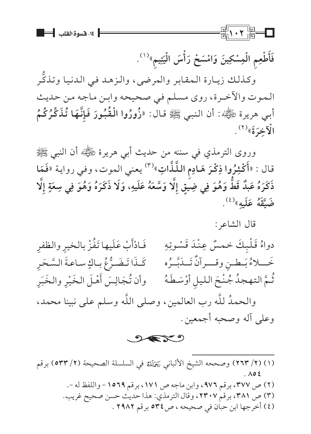 وكذلك زيارة المقابر والمرضى، والزهد في الدنيا وتذكُّر الموت والآخرة، روى مسلم في صحيحه وابن ماجه من حديث أبي هريرة رضي اللهُ عنه: أن النبي صلَّى اللهُ عليه وسلَّم قال: «زُورُوا الْقُبُورَ فَإِنَّهَا تُذَكِّرُكُمُ الْآخِرَةَ» (¬٢).