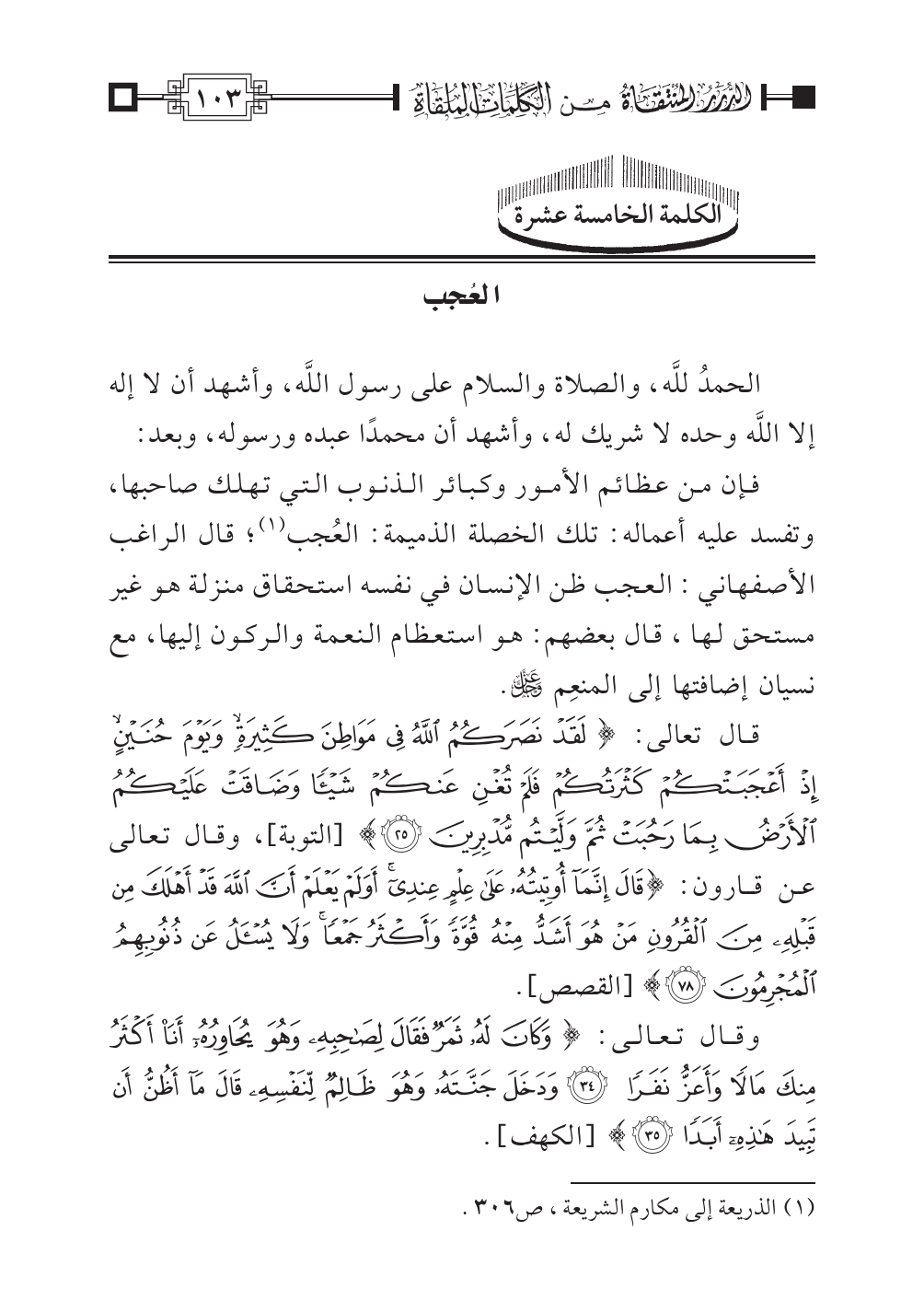 فإن من عظائم الأمور وكبائر الذنوب التي تهلك صاحبها، وتفسد عليه أعماله: تلك الخصلة الذميمة: العُجب (¬١)؛ قال الراغب الأصفهاني: العجب ظن الإنسان في نفسه استحقاق منزلة هو غير مستحق لها، قال بعضهم: هو استعظام النعمة والركون إليها، مع نسيان إضافتها إلى المنعِم عزَّ وجلَّ.