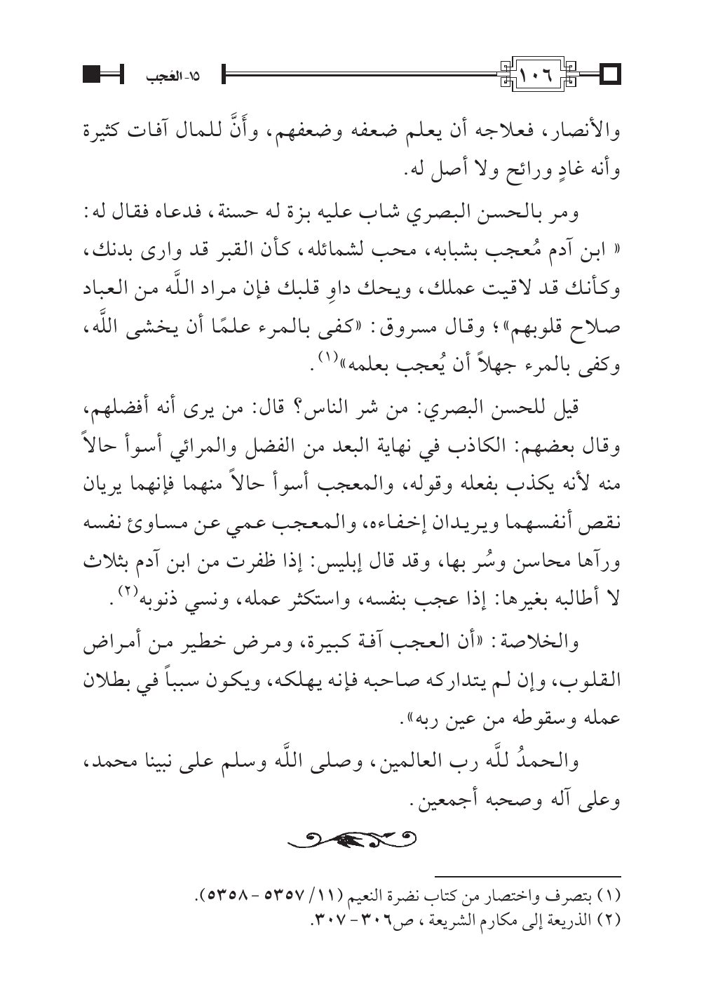 والخلاصة: «أن العجب آفة كبيرة، ومرض خطير من أمراض القلوب، وإن لم يتداركه صاحبه فإنه يهلكه، ويكون سبباً في بطلان عمله وسقوطه من عين ربه».