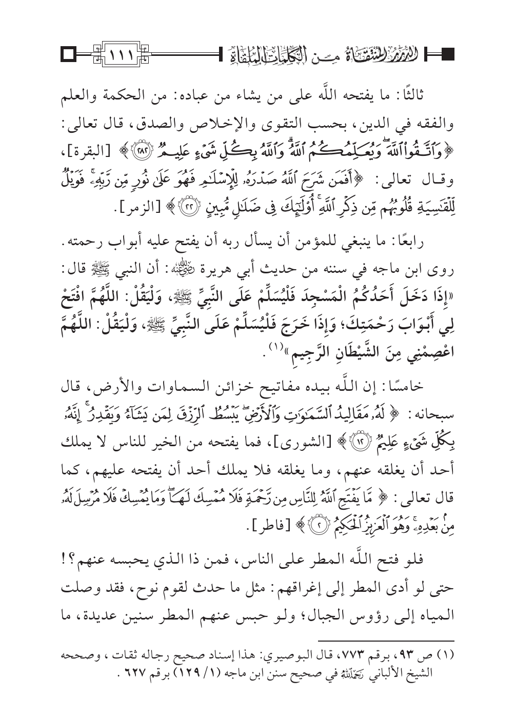 ثالثًا: ما يفتحه اللَّه على من يشاء من عباده: من الحكمة والعلم والفقه في الدين، بحسب التقوى والإخلاص والصدق، قال تعالى: {وَاتَّقُوا اللهَ وَيُعَلِّمُكُمُ اللهُ وَاللهُ بِكُلِّ شَيْءٍ عَلِيم (٢٨٢)} [البقرة]، وقال تعالى: {أَفَمَن شَرَحَ اللَّهُ صَدْرَهُ لِلإِسْلَامِ فَهُوَ عَلَى نُورٍ مِّن رَّبِّهِ فَوَيْلٌ لِّلْقَاسِيَةِ قُلُوبُهُم مِّن ذِكْرِ اللَّهِ أُوْلَئِكَ فِي ضَلَالٍ مُبِين (٢٢)} [الزمر].