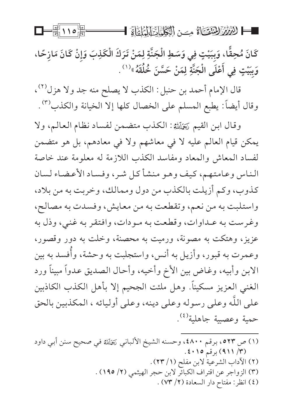 قال الإمام أحمد بن حنبل: الكذب لا يصلح منه جد ولا هزل (¬٢)، وقال أيضاً: يطبع المسلم على الخصال كلها إلا الخيانة والكذب (¬٣).
