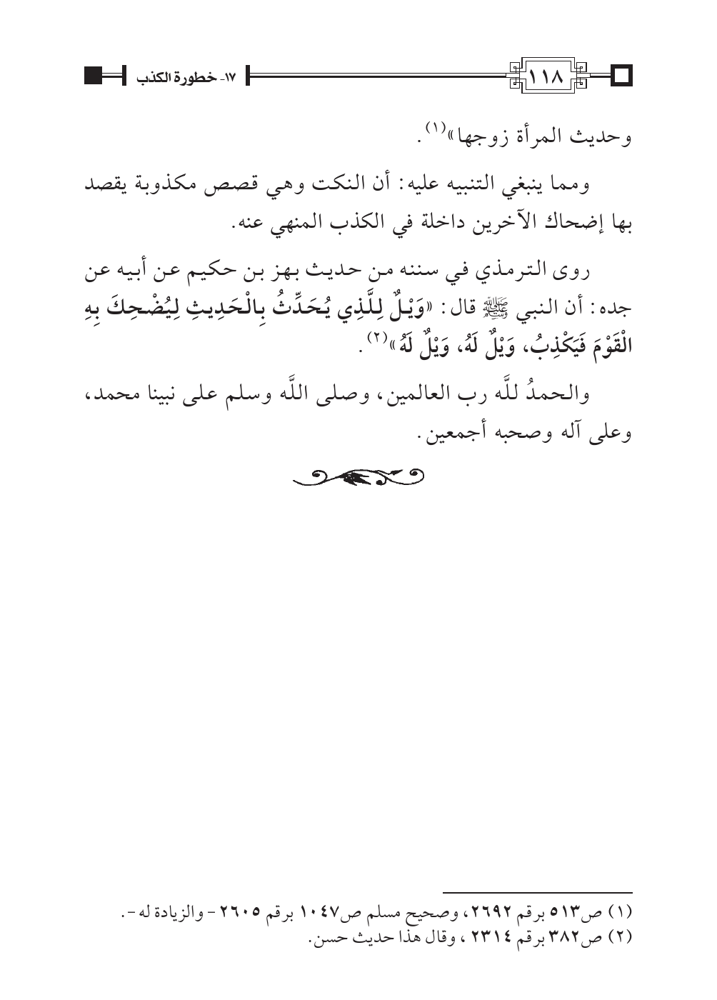 روى الترمذي في سننه من حديث بهز بن حكيم عن أبيه عن جده: أن النبي صلَّى اللهُ عليه وسلَّم قال: «وَيْلٌ لِلَّذِي يُحَدِّثُ بِالْحَدِيثِ لِيُضْحِكَ بِهِ الْقَوْمَ فَيَكْذِبُ، وَيْلٌ لَهُ، وَيْلٌ لَهُ» (¬٢).