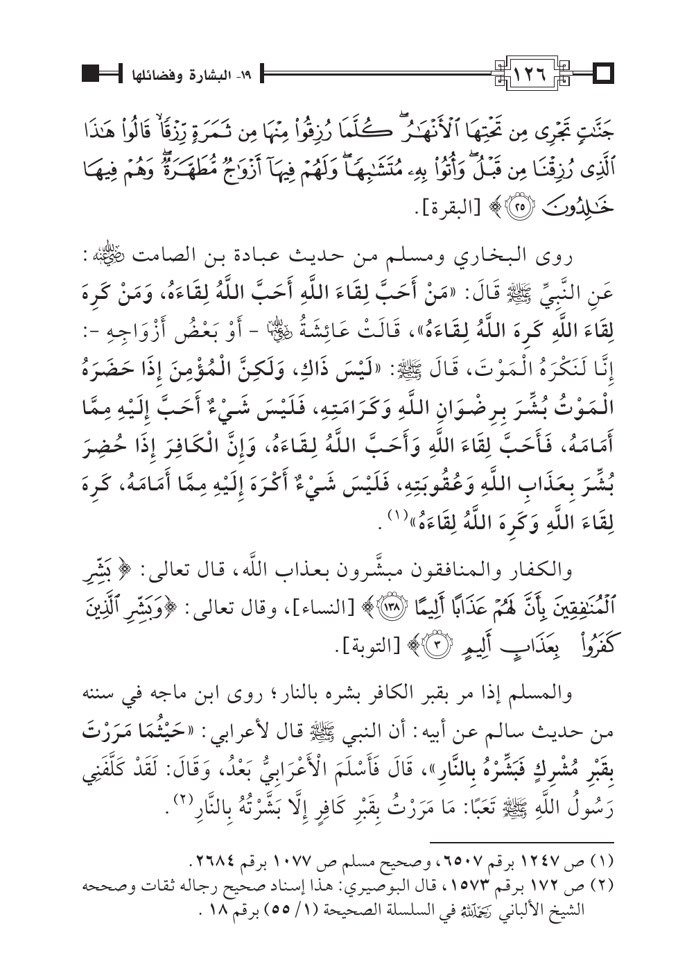 روى البخاري ومسلم من حديث عبادة بن الصامت رضي اللهُ عنه: عَنِ النَّبِيِّ صلَّى اللهُ عليه وسلَّم قَالَ: «مَنْ أَحَبَّ لِقَاءَ اللَّهِ أَحَبَّ اللَّهُ لِقَاءَهُ، وَمَنْ كَرِهَ لِقَاءَ اللَّهِ كَرِهَ اللَّهُ لِقَاءَهُ»، قَالَتْ عَائِشَةُ رضي الله عنها - أَوْ بَعْضُ أَزْوَاجِهِ -: إِنَّا لَنَكْرَهُ الْمَوْتَ، قَالَ صلَّى اللهُ عليه وسلَّم: «لَيْسَ ذَاكِ، وَلَكِنَّ الْمُؤْمِنَ إِذَا حَضَرَهُ الْمَوْتُ بُشِّرَ بِرِضْوَانِ اللَّهِ وَكَرَامَتِهِ، فَلَيْسَ شَيْءٌ أَحَبَّ إِلَيْهِ مِمَّا أَمَامَهُ، فَأَحَبَّ لِقَاءَ اللَّهِ وَأَحَبَّ اللَّهُ لِقَاءَهُ، وَإِنَّ الْكَافِرَ إِذَا حُضِرَ بُشِّرَ بِعَذَابِ اللَّهِ وَعُقُوبَتِهِ، فَلَيْسَ شَيْءٌ أَكْرَهَ إِلَيْهِ مِمَّا أَمَامَهُ، كَرِهَ لِقَاءَ اللَّهِ وَكَرِهَ اللَّهُ لِقَاءَهُ» (¬١).