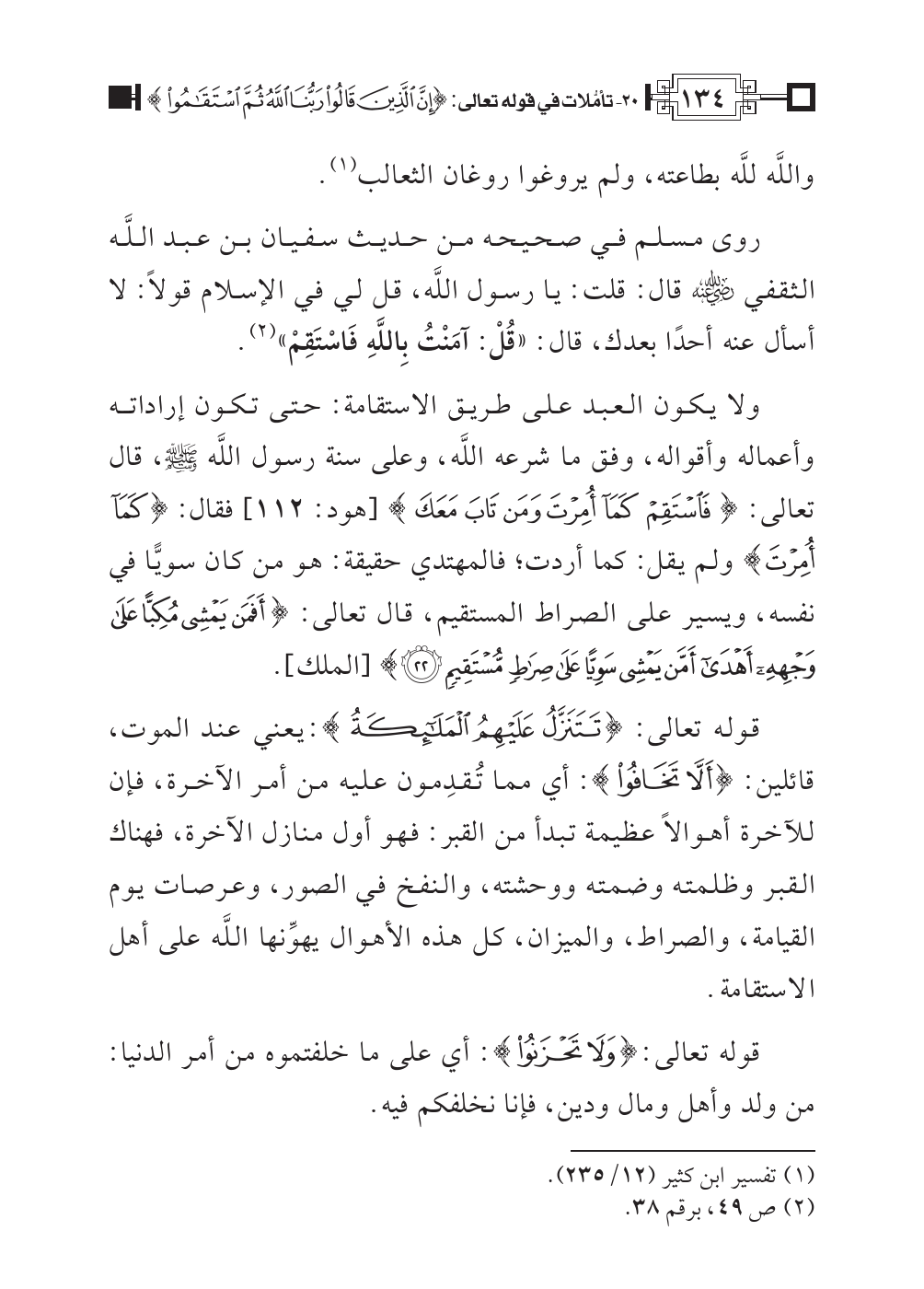 روى مسلم في صحيحه من حديث سفيان بن عبد اللَّه الثقفي رضي اللهُ عنه قال: قلت: يا رسول اللَّه، قل لي في الإسلام قولاً: لا أسأل عنه أحدًا بعدك، قال: «قُلْ: آمَنْتُ بِاللَّهِ فَاسْتَقِمْ» (¬٢).