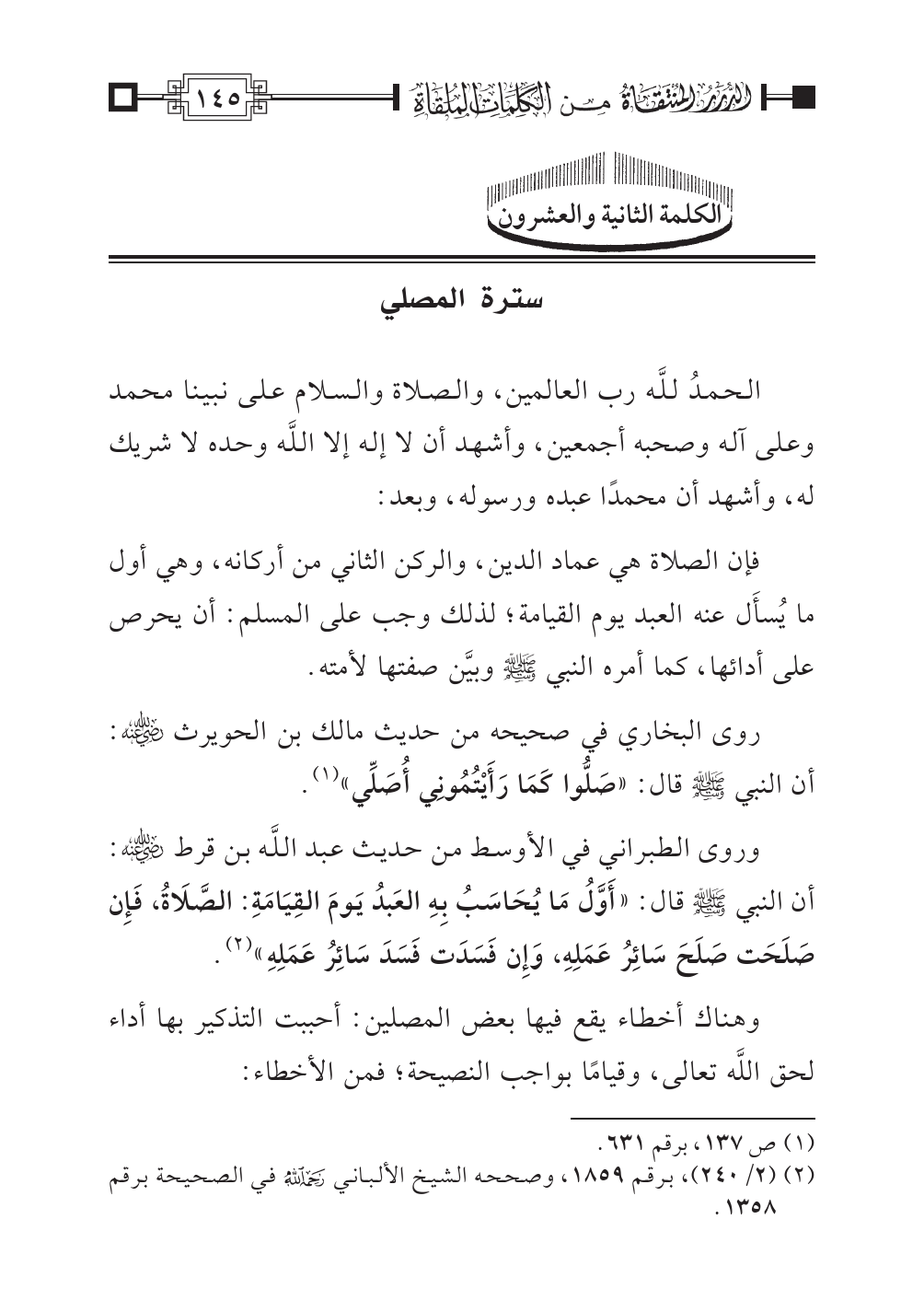 وهناك أخطاء يقع فيها بعض المصلين: أحببت التذكير بها أداء لحق اللَّه تعالى، وقيامًا بواجب النصيحة؛ فمن الأخطاء: