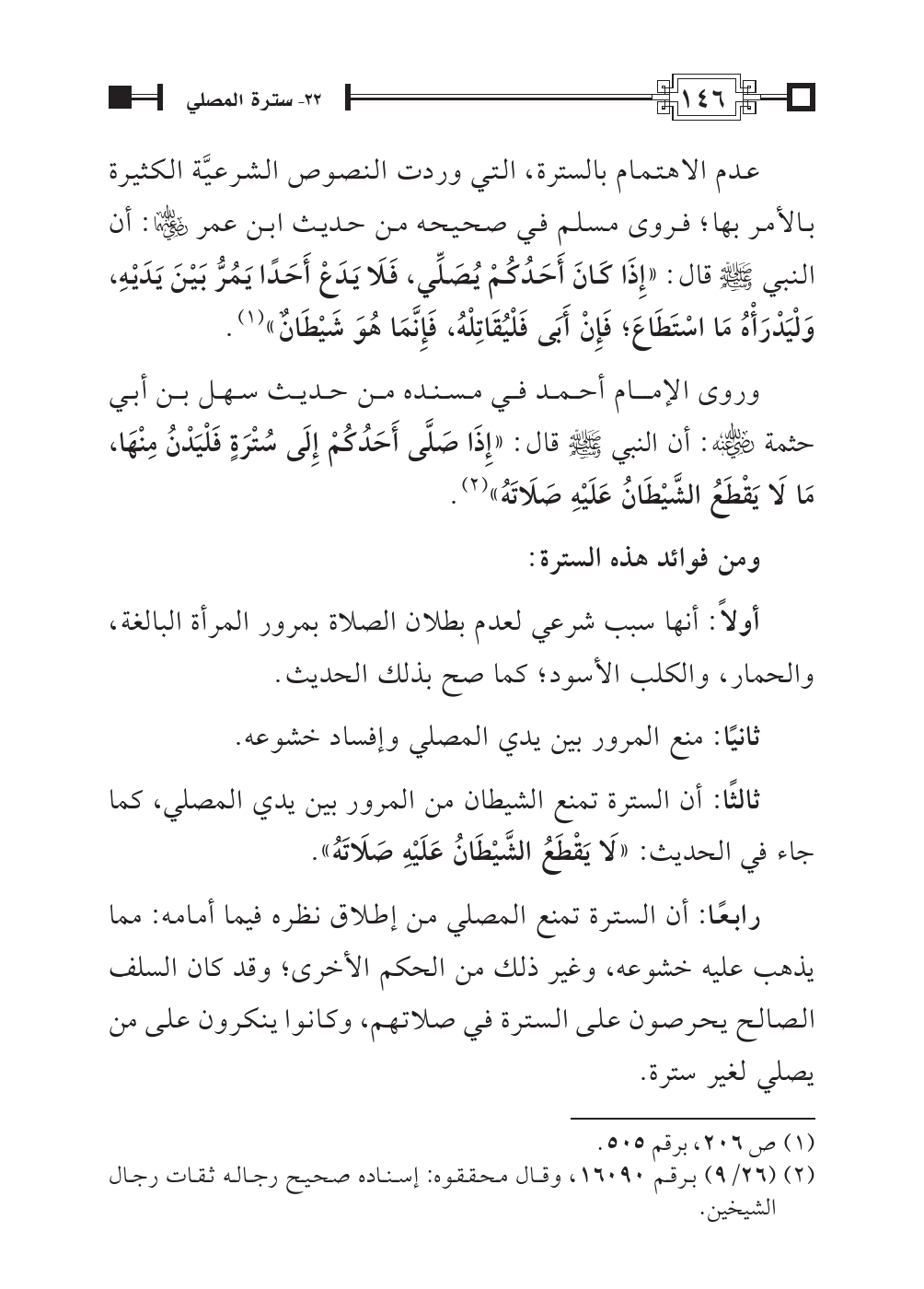 عدم الاهتمام بالسترة، التي وردت النصوص الشرعيَّة الكثيرة بالأمر بها؛ فروى مسلم في صحيحه من حديث ابن عمر رضي اللهُ عنهما: أن النبي صلَّى اللهُ عليه وسلَّم قال: «إِذَا كَانَ أَحَدُكُمْ يُصَلِّي، فَلَا يَدَعْ أَحَدًا يَمُرُّ بَيْنَ يَدَيْهِ، وَلْيَدْرَاهُ مَا اسْتَطَاعَ؛ فَإِنْ أَبَى فَلْيُقَاتِلْهُ، فَإِنَّمَا هُوَ شَيْطَانٌ» (¬١).