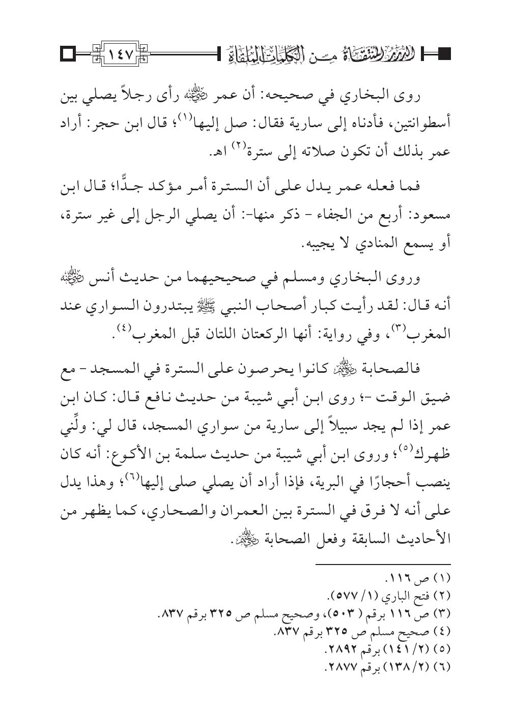 فالصحابة رضي اللهُ عنهم كانوا يحرصون على السترة في المسجد - مع ضيق الوقت -؛ روى ابن أبي شيبة من حديث نافع قال: كان ابن عمر إذا لم يجد سبيلاً إلى سارية من سواري المسجد، قال لي: ولِّني ظهرك (¬٥)؛ وروى ابن أبي شيبة من حديث سلمة بن الأكوع: أنه كان ينصب أحجارًا في البرية، فإذا أراد أن يصلي صلى إليها (¬٦)؛ وهذا يدل على أنه لا فرق في السترة بين العمران والصحاري، كما يظهر من الأحاديث السابقة وفعل الصحابة رضي اللهُ عنهم.