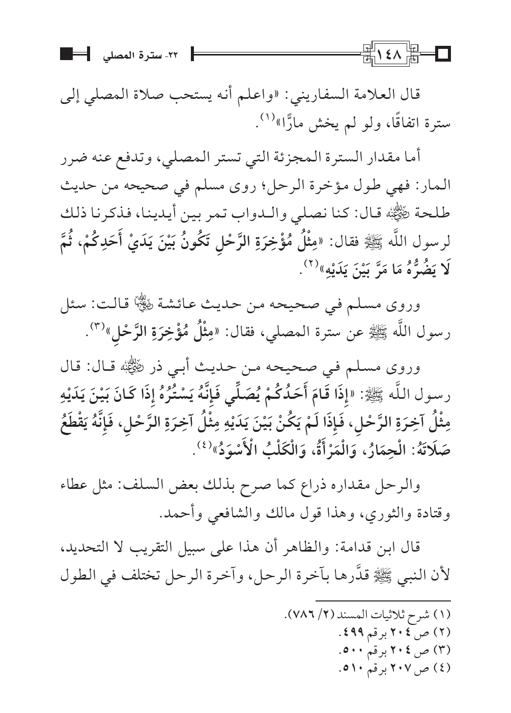 وروى مسلم في صحيحه من حديث عائشة رضي الله عنها قالت: سئل رسول اللَّه صلَّى اللهُ عليه وسلَّم عن سترة المصلي، فقال: «مِثْلُ مُؤْخِرَةِ الرَّحْلِ» (¬٣).