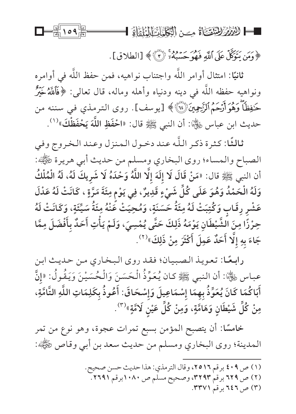 ثالثًا: كثرة ذكر اللَّه عند دخول المنزل وعند الخروج وفي الصباح والمساء؛ روى البخاري ومسلم من حديث أبي هريرة رضي اللهُ عنه: أن النبي صلَّى اللهُ عليه وسلَّم قال: «مَنْ قَالَ لَا إِلَهَ إِلَّا اللَّهُ وَحْدَهُ لَا شَرِيكَ لَهُ، لَهُ الْمُلْكُ وَلَهُ الْحَمْدُ وَهُوَ عَلَى كُلِّ شَيْءٍ قَدِيرٌ، فِي يَوْمٍ مِئَةَ مَرَّةٍ، كَانَتْ لَهُ عَدْلَ عَشْرِ رِقَابٍ وَكُتِبَتْ لَهُ مِئَةُ حَسَنَةٍ، وَمُحِيَتْ عَنْهُ مِئَةُ سَيِّئَةٍ، وَكَانَتْ لَهُ حِرْزًا مِنَ الشَّيْطَانِ يَوْمَهُ ذَلِكَ حَتَّى يُمْسِيَ، وَلَمْ يَأتِ أَحَدٌ بِأَفْضَلَ مِمَّا جَاءَ بِهِ إِلَّا أَحَدٌ عَمِلَ أَكْثَرَ مِنْ ذَلِكَ» (¬٢).