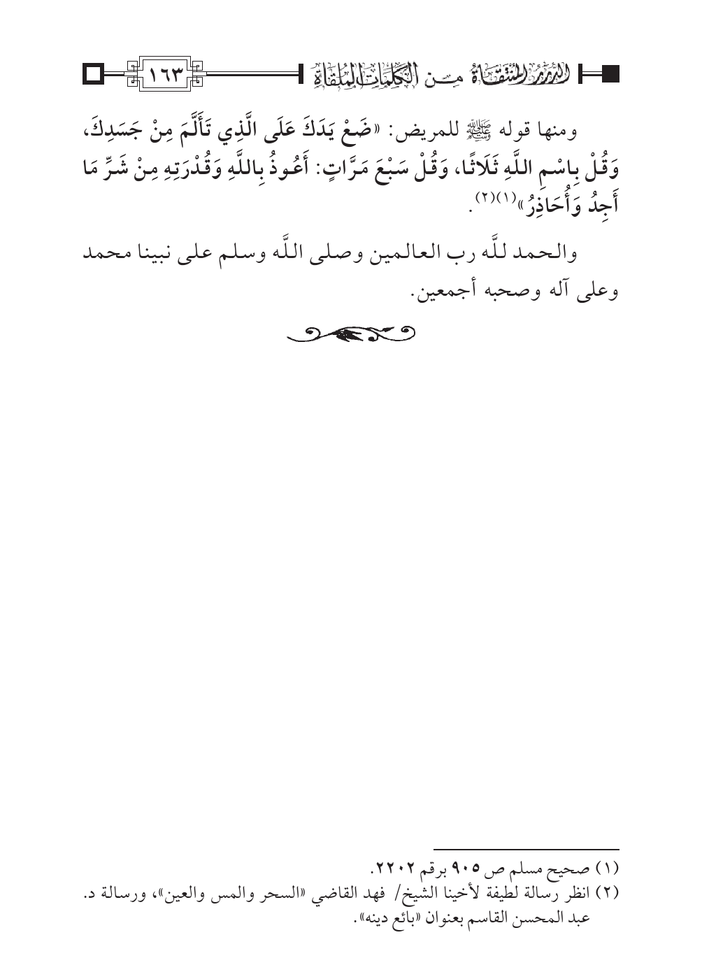 (¬٢) انظر رسالة لطيفة لأخينا الشيخ/ فهد القاضي «السحر والمس والعين»، ورسالة د. عبد المحسن القاسم بعنوان «بائع دينه».