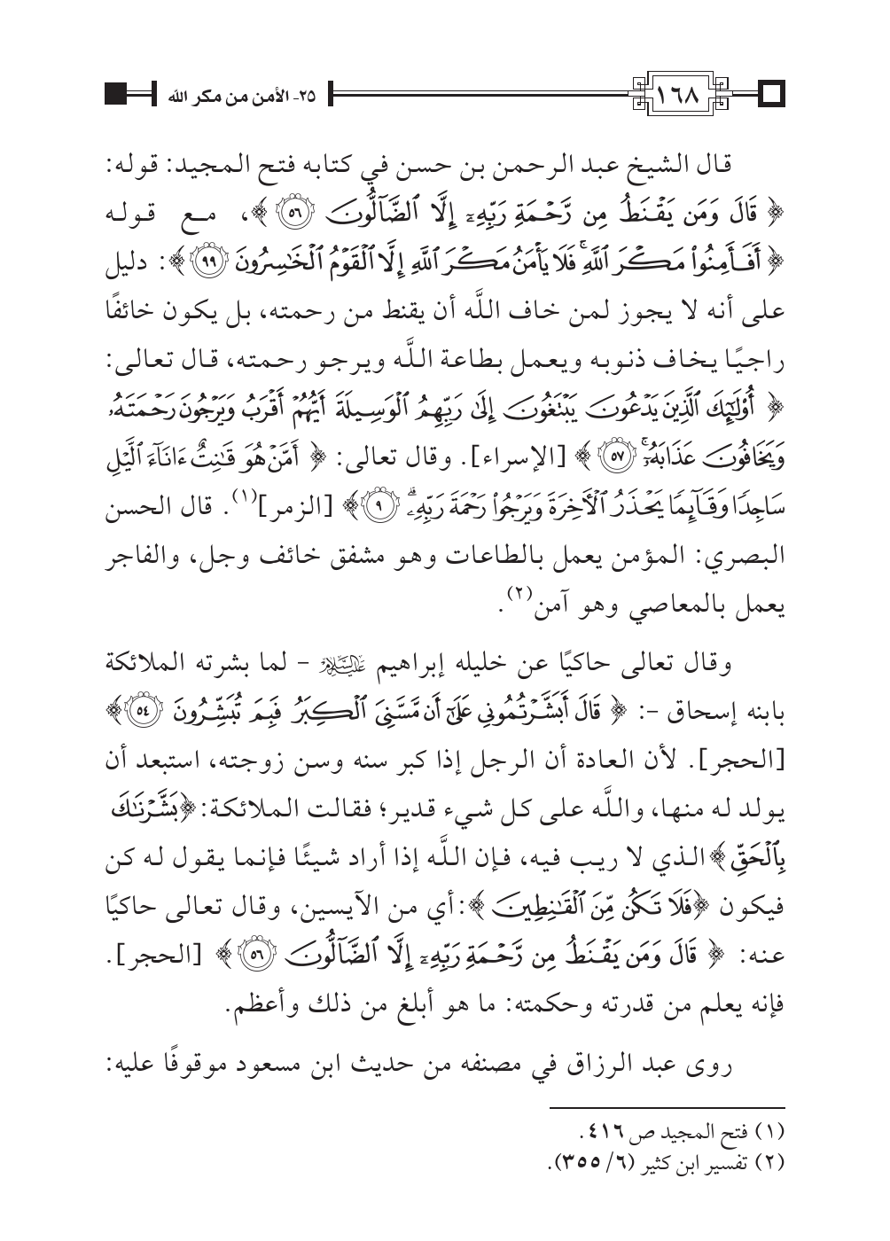 قال الشيخ عبد الرحمن بن حسن في كتابه فتح المجيد: قوله: {قَالَ وَمَن يَقْنَطُ مِن رَّحْمَةِ رَبِّهِ إِلَاّ الضَّآلُّون (٥٦)}، مع قوله {أَفَأَمِنُوا مَكْرَ اللهِ فَلَا يَامَنُ مَكْرَ اللهِ إِلَاّ الْقَوْمُ الْخَاسِرُون (٩٩)}: دليل على أنه لا يجوز لمن خاف اللَّه أن يقنط من رحمته، بل يكون خائفًا راجيًا يخاف ذنوبه ويعمل بطاعة اللَّه ويرجو رحمته، قال تعالى: {أُولَئِكَ الَّذِينَ يَدْعُونَ يَبْتَغُونَ إِلَى رَبِّهِمُ الْوَسِيلَةَ أَيُّهُمْ أَقْرَبُ وَيَرْجُونَ رَحْمَتَهُ وَيَخَافُونَ عَذَابَهُ} [الإسراء: ٥٧]. وقال تعالى: {أَمَّنْ هُوَ قَانِتٌ آنَاء اللَّيْلِ سَاجِدًا وَقَائِمًا يَحْذَرُ الآخِرَةَ وَيَرْجُو رَحْمَةَ رَبِّهِ} [الزمر: ٩] (¬١). قال الحسن البصري: المؤمن يعمل بالطاعات وهو مشفق خائف وجل، والفاجر يعمل بالمعاصي وهو آمن (¬٢).