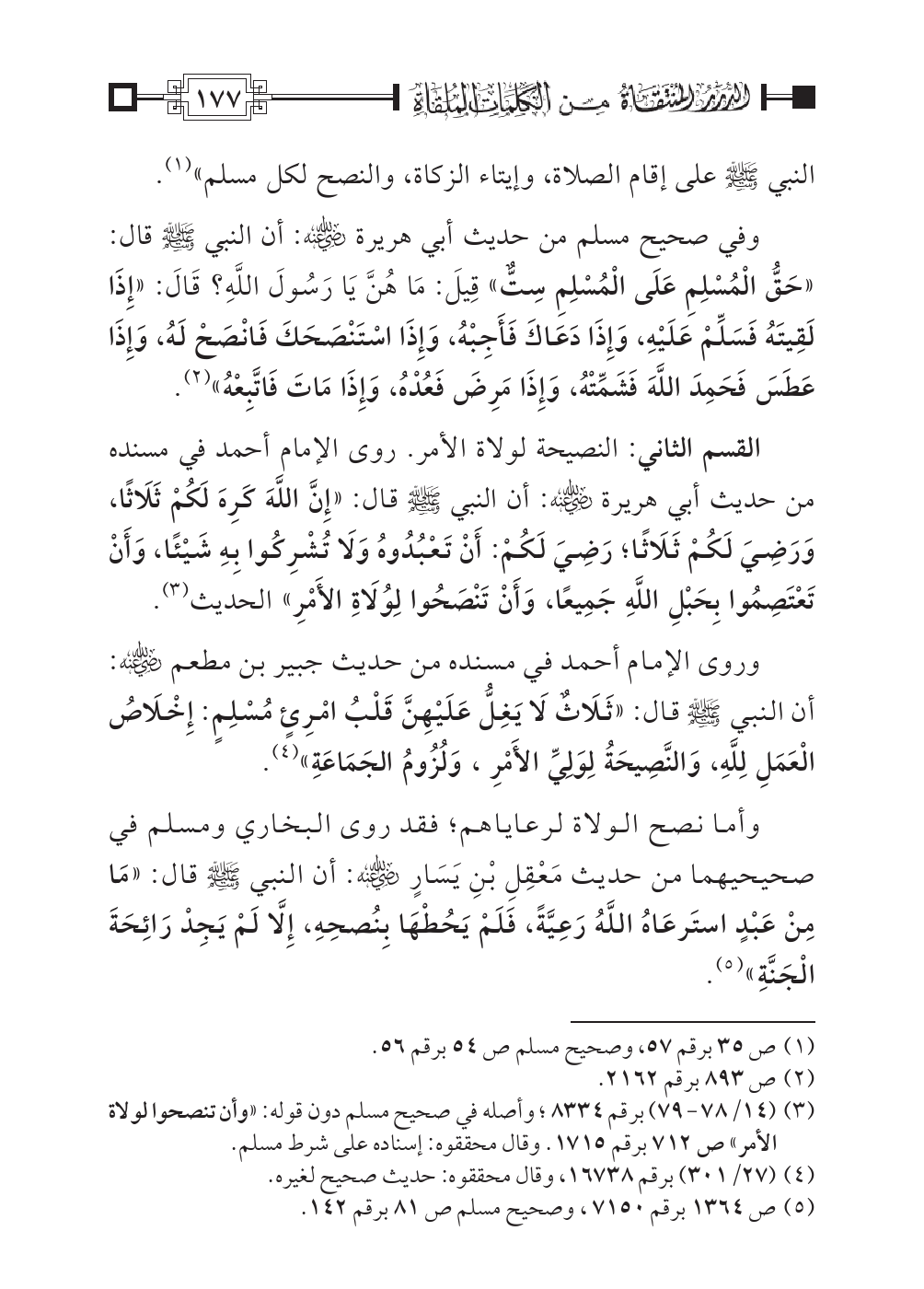 القسم الثاني: النصيحة لولاة الأمر. روى الإمام أحمد في مسنده من حديث أبي هريرة رضي اللهُ عنه: أن النبي صلَّى اللهُ عليه وسلَّم قال: «إِنَّ اللَّهَ كَرِهَ لَكُمْ ثَلَاثًا، وَرَضِيَ لَكُمْ ثَلَاثًا؛ رَضِيَ لَكُمْ: أَنْ تَعْبُدُوهُ وَلَا تُشْرِكُوا بِهِ شَيْئًا، وَأَنْ تَعْتَصِمُوا بِحَبْلِ اللَّهِ جَمِيعًا، وَأَنْ تَنْصَحُوا لِوُلَاةِ الأَمْرِ» الحديث (¬٣).