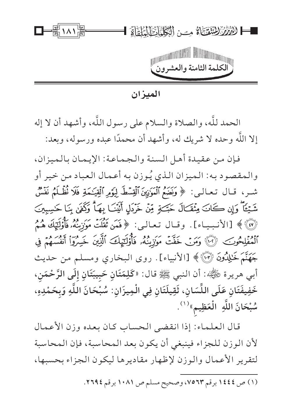 فإن من عقيدة أهل السنة والجماعة: الإيمان بالميزان، والمقصود به: الميزان الذي يُوزن به أعمال العباد من خير أو شر، قال تعالى: {وَنَضَعُ الْمَوَازِينَ الْقِسْطَ لِيَوْمِ الْقِيَامَةِ فَلَا تُظْلَمُ نَفْسٌ شَيْئًا وَإِن كَانَ مِثْقَالَ حَبَّةٍ مِّنْ خَرْدَلٍ أَتَيْنَا بِهَا وَكَفَى بِنَا حَاسِبِين (٤٧)} [الأنبياء]. وقال تعالى: {فَمَن ثَقُلَتْ مَوَازِينُهُ فَأُوْلَئِكَ هُمُ الْمُفْلِحُون (١٠٢) وَمَنْ خَفَّتْ مَوَازِينُهُ فَأُوْلَئِكَ الَّذِينَ خَسِرُوا أَنفُسَهُمْ فِي جَهَنَّمَ خَالِدُون (١٠٣)} [المؤمنون]. روى البخاري ومسلم من حديث أبي هريرة رضي اللهُ عنه: أن النبي صلَّى اللهُ عليه وسلَّم قال: «كَلِمَتَانِ حَبِيبَتَانِ إِلَى الرَّحْمَنِ، خَفِيفَتَانِ عَلَى اللِّسَانِ، ثَقِيلَتَانِ فِي الْمِيزَانِ: سُبْحَانَ اللَّهِ وَبِحَمْدِهِ، سُبْحَانَ اللَّهِ الْعَظِيمِ» (¬١).