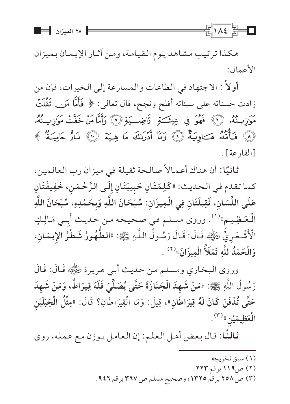 ثانيًا: أن هناك أعمالاً صالحة ثقيلة في ميزان رب العالمين، كما تقدم في الحديث: «كَلِمَتَانِ حَبِيبَتَانِ إِلَى الرَّحْمَنِ، خَفِيفَتَانِ عَلَى اللِّسَانِ، ثَقِيلَتَانِ فِي الْمِيزَانِ: سُبْحَانَ اللَّهِ وَبِحَمْدِهِ، سُبْحَانَ اللَّهِ الْعَظِيمِ» (¬١). وروى مسلم في صحيحه من حديث أَبِي مَالِكٍ الْأَشْعَرِيِّ رضي اللهُ عنه قَالَ: قَالَ رَسُولُ اللَّهِ صلَّى اللهُ عليه وسلَّم: «الطُّهُورُ شَطْرُ الإِيمَانِ، وَالْحَمْدُ للَّهِ تَمْلَأُ الْمِيزَانَ» (¬٢).