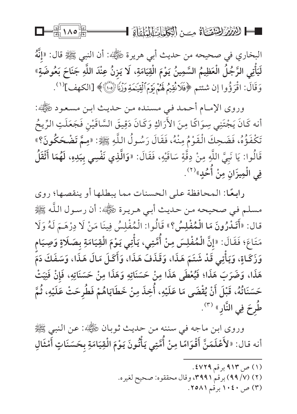 رابعًا: المحافظة على الحسنات مما يبطلها أو ينقصها؛ روى مسلم في صحيحه من حديث أبي هريرة رضي اللهُ عنه: أن رسول اللَّه صلَّى اللهُ عليه وسلَّم قال: «أَتَدْرُونَ مَا الْمُفْلِسُ؟ » قَالُوا: الْمُفْلِسُ فِينَا مَنْ لَا دِرْهَمَ لَهُ وَلَا مَتَاعَ؛ فَقَالَ: «إِنَّ الْمُفْلِسَ مِنْ أُمَّتِي، يَاتِي يَوْمَ الْقِيَامَةِ بِصَلَاةٍ وَصِيَامٍ وَزَكَاةٍ، وَيَاتِي قَدْ شَتَمَ هَذَا، وَقَذَفَ هَذَا، وَأَكَلَ مَالَ هَذَا، وَسَفَكَ دَمَ هَذَا، وَضَرَبَ هَذَا؛ فَيُعْطَى هَذَا مِنْ حَسَنَاتِهِ وَهَذَا مِنْ حَسَنَاتِهِ، فَإِنْ فَنِيَتْ حَسَنَاتُهُ، قَبْلَ أَنْ يُقْضَى مَا عَلَيْهِ، أُخِذَ مِنْ خَطَايَاهُمْ فَطُرِحَتْ عَلَيْهِ، ثُمَّ طُرِحَ فِي النَّارِ» (¬٣).