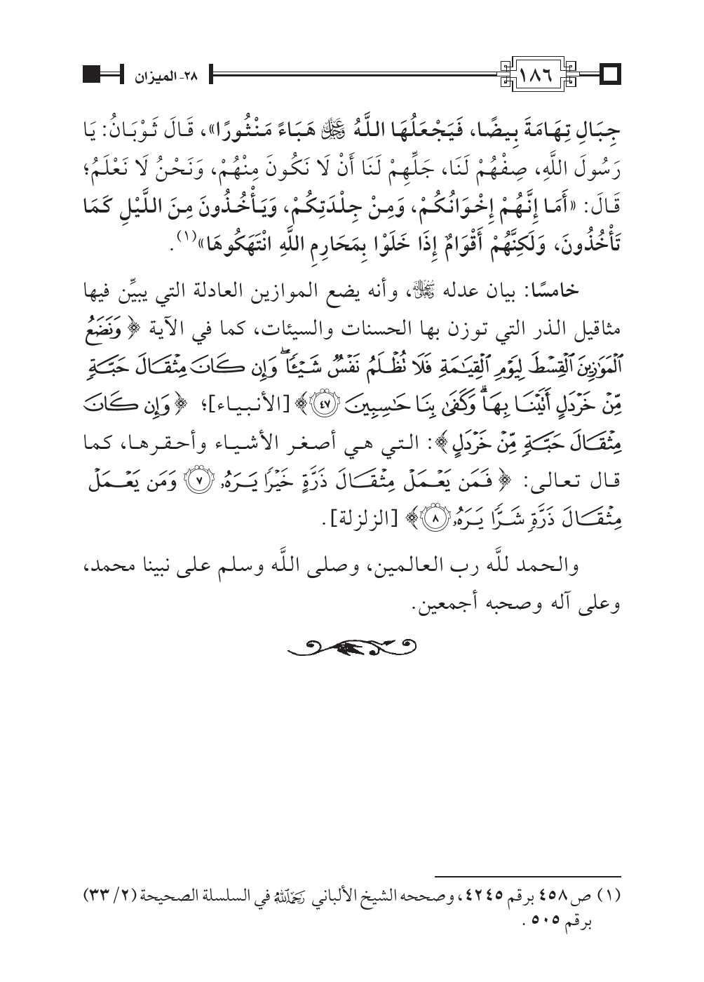 خامسًا: بيان عدله سبحانه وتعالى، وأنه يضع الموازين العادلة التي يبيِّن فيها مثاقيل الذر التي توزن بها الحسنات والسيئات، كما في الآية {وَنَضَعُ الْمَوَازِينَ الْقِسْطَ لِيَوْمِ الْقِيَامَةِ فَلَا تُظْلَمُ نَفْسٌ شَيْئًا وَإِن كَانَ مِثْقَالَ حَبَّةٍ مِّنْ خَرْدَلٍ أَتَيْنَا بِهَا وَكَفَى بِنَا حَاسِبِين (٤٧)} [الأنبياء]؛ {وَإِن كَانَ مِثْقَالَ حَبَّةٍ مِّنْ خَرْدَلٍ}: التي هي أصغر الأشياء وأحقرها، كما قال تعالى: {فَمَن يَعْمَلْ مِثْقَالَ ذَرَّةٍ خَيْرًا يَرَه (٧) وَمَن يَعْمَلْ مِثْقَالَ ذَرَّةٍ شَرًّا يَرَه (٨)} [الزلزلة].