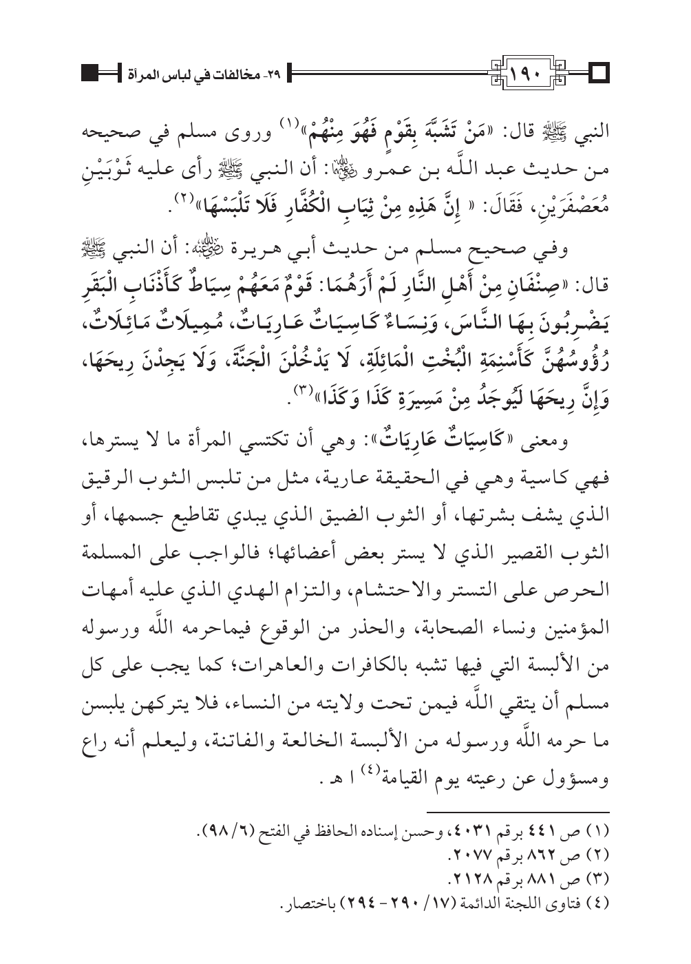 ومعنى «كَاسِيَاتٌ عَارِيَاتٌ»: وهي أن تكتسي المرأة ما لا يسترها، فهي كاسية وهي في الحقيقة عارية، مثل من تلبس الثوب الرقيق الذي يشف بشرتها، أو الثوب الضيق الذي يبدي تقاطيع جسمها، أو الثوب القصير الذي لا يستر بعض أعضائها؛ فالواجب على المسلمة الحرص على التستر والاحتشام، والتزام الهدي الذي عليه أمهات المؤمنين ونساء الصحابة، والحذر من الوقوع فيماحرمه اللَّه ورسوله من الألبسة التي فيها تشبه بالكافرات والعاهرات؛ كما يجب على كل مسلم أن يتقي اللَّه فيمن تحت ولايته من النساء، فلا يتركهن يلبسن ما حرمه اللَّه ورسوله من الألبسة الخالعة والفاتنة، وليعلم أنه راع ومسؤول عن رعيته يوم القيامة (¬٤) اهـ.