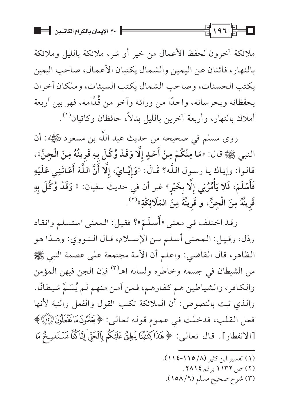 وقد اختلف في معنى «أَسلَمَ»؟ فقيل: المعنى استسلم وانقاد وذل، وقيل: المعنى أسلم من الإسلام، قال النووي: وهذا هو الظاهر، قال القاضي: واعلم أن الأمة مجتمعة على عصمة النبي صلَّى اللهُ عليه وسلَّم من الشيطان في جسمه وخاطره ولسانه اهـ (¬٣) فإن الجن فيهن المؤمن والكافر، والشياطين هم كفارهم، فمن آمن منهم لم يُسَمَّ شيطانًا. والذي ثبت بالنصوص: أن الملائكة تكتب القول والفعل والنية لأنها فعل القلب، فدخلت في عموم قوله تعالى: {يَعْلَمُونَ مَا تَفْعَلُون (١٢)} [الانفطار]. قال تعالى: {هَذَا كِتَابُنَا يَنطِقُ عَلَيْكُم بِالْحَقِّ إِنَّا كُنَّا نَسْتَنسِخُ مَا