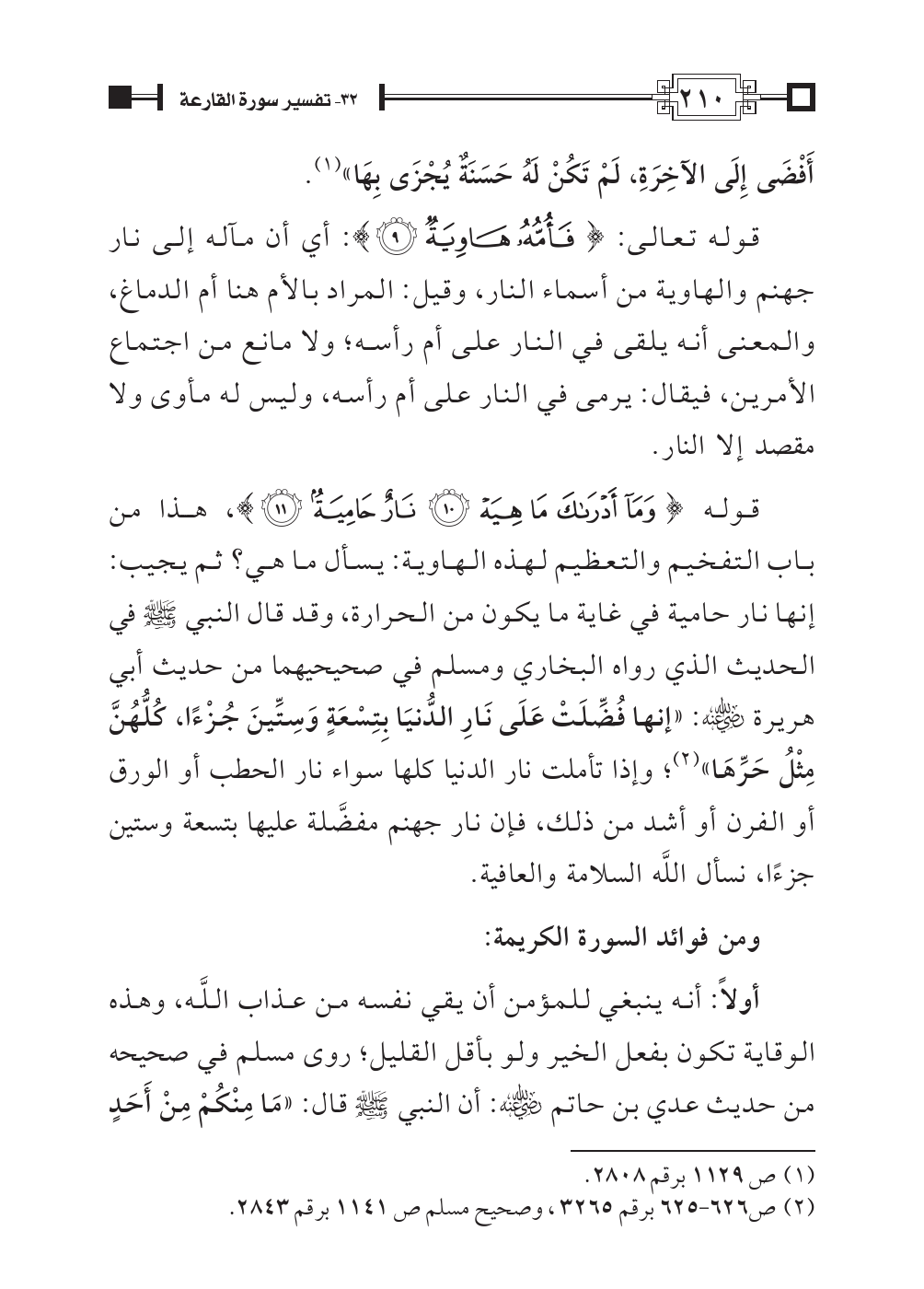 قوله: {وَمَا أَدْرَاكَ مَا هِيَه (١٠) نَارٌ حَامِيَة (١١)}، هذا من باب التفخيم والتعظيم لهذه الهاوية: يسأل ما هي؟ ثم يجيب: إنها نار حامية في غاية ما يكون من الحرارة، وقد قال النبي صلَّى اللهُ عليه وسلَّم في الحديث الذي رواه البخاري ومسلم في صحيحيهما من حديث أبي هريرة رضي اللهُ عنه: «إنها فُضِّلَتْ عَلَى نَارِ الدُّنيَا بِتِسْعَةٍ وَسِتِّينَ جُزْءًا، كُلُّهُنَّ مِثْلُ حَرِّهَا» (¬٢)؛ وإذا تأملت نار الدنيا كلها سواء نار الحطب أو الورق أو الفرن أو أشد من ذلك، فإن نار جهنم مفضَّلة عليها بتسعة وستين جزءًا، نسأل اللَّه السلامة والعافية.