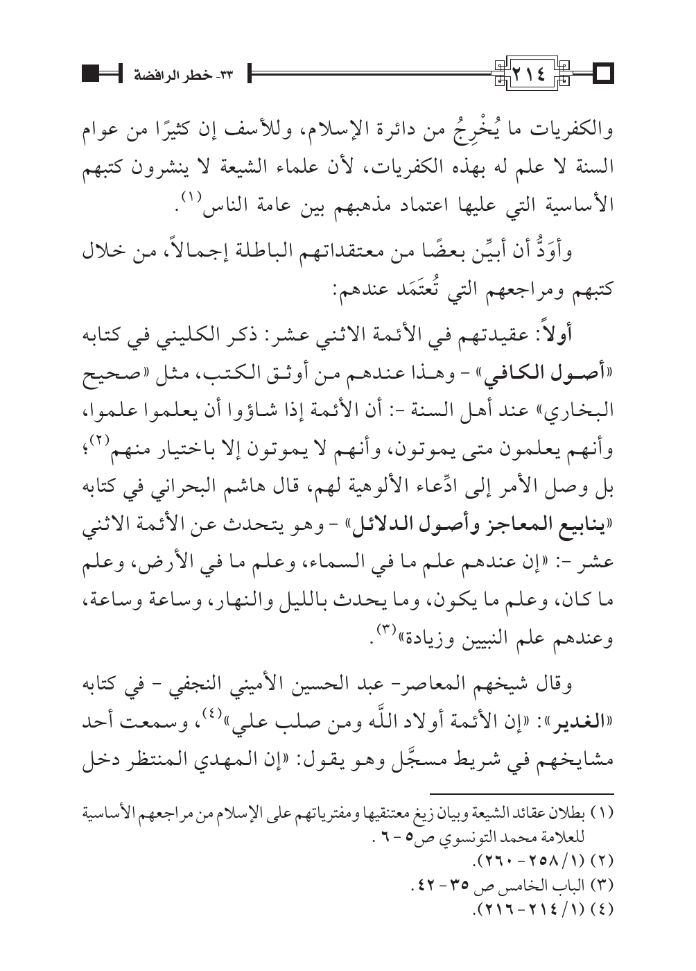 والكفريات ما يُخْرِجُ من دائرة الإسلام، وللأسف إن كثيرًا من عوام السنة لا علم له بهذه الكفريات، لأن علماء الشيعة لا ينشرون كتبهم الأساسية التي عليها اعتماد مذهبهم بين عامة الناس (¬١).