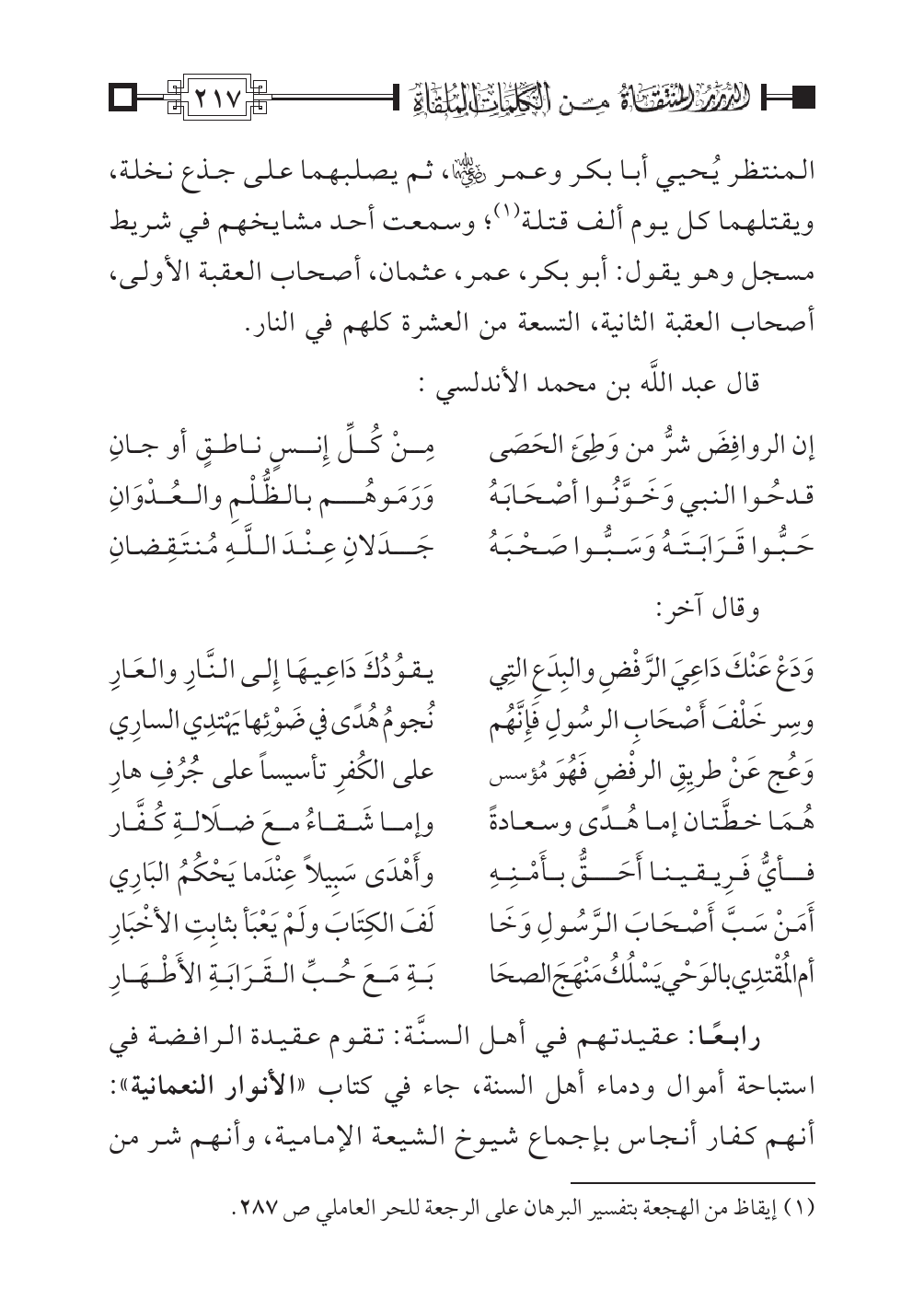 وأَهْدَى سَبِيلاً عِنْدَما يَحْكُمُ البَارِي ... أَمَنْ سَبَّ أَصْحَابَ الرَّسُولِ وَخَا