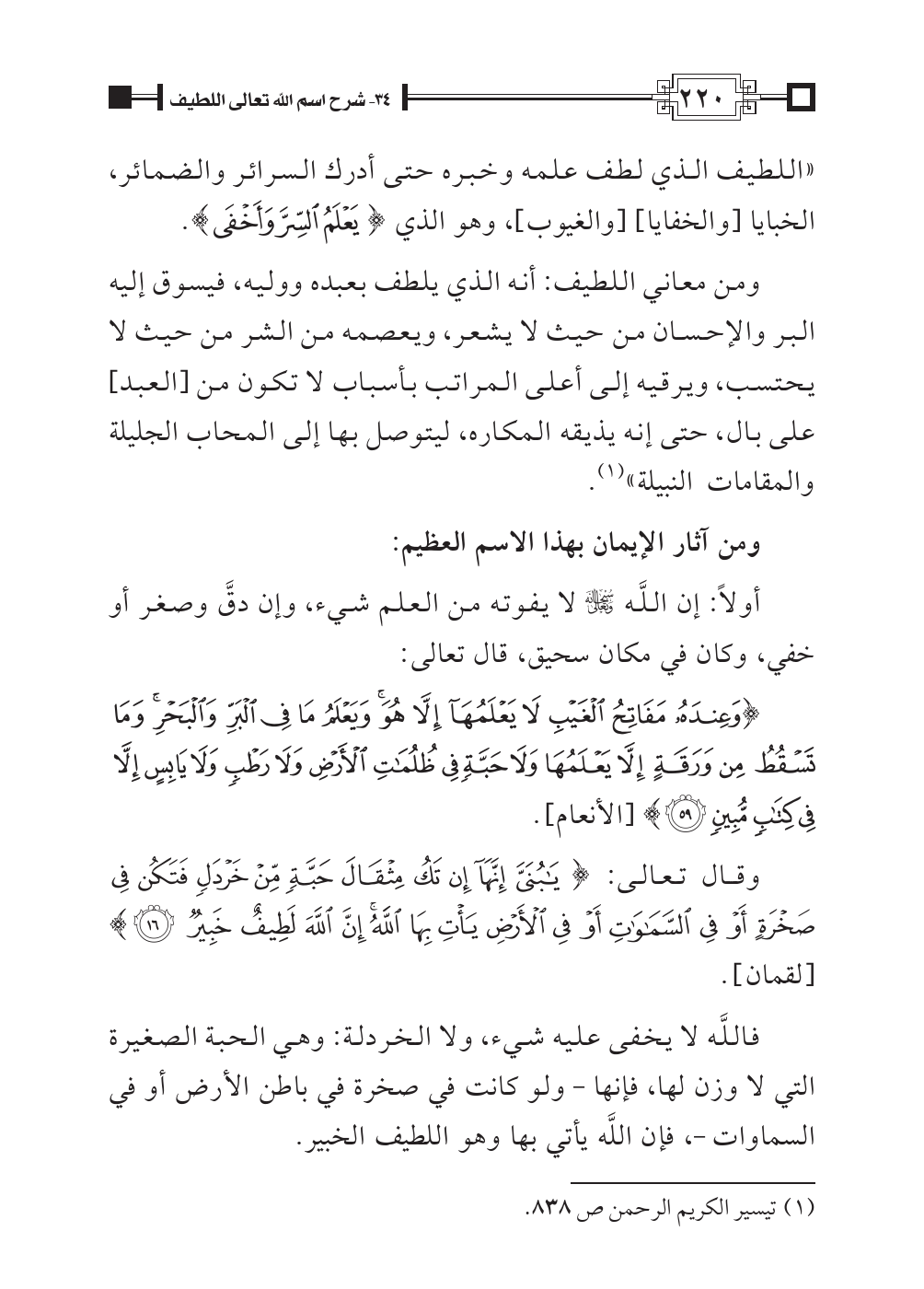 «اللطيف الذي لطف علمه وخبره حتى أدرك السرائر والضمائر، الخبايا [والخفايا] [والغيوب]، وهو الذي {يَعْلَمُ السِّرَّ وَأَخْفَى} [طه: ٧].