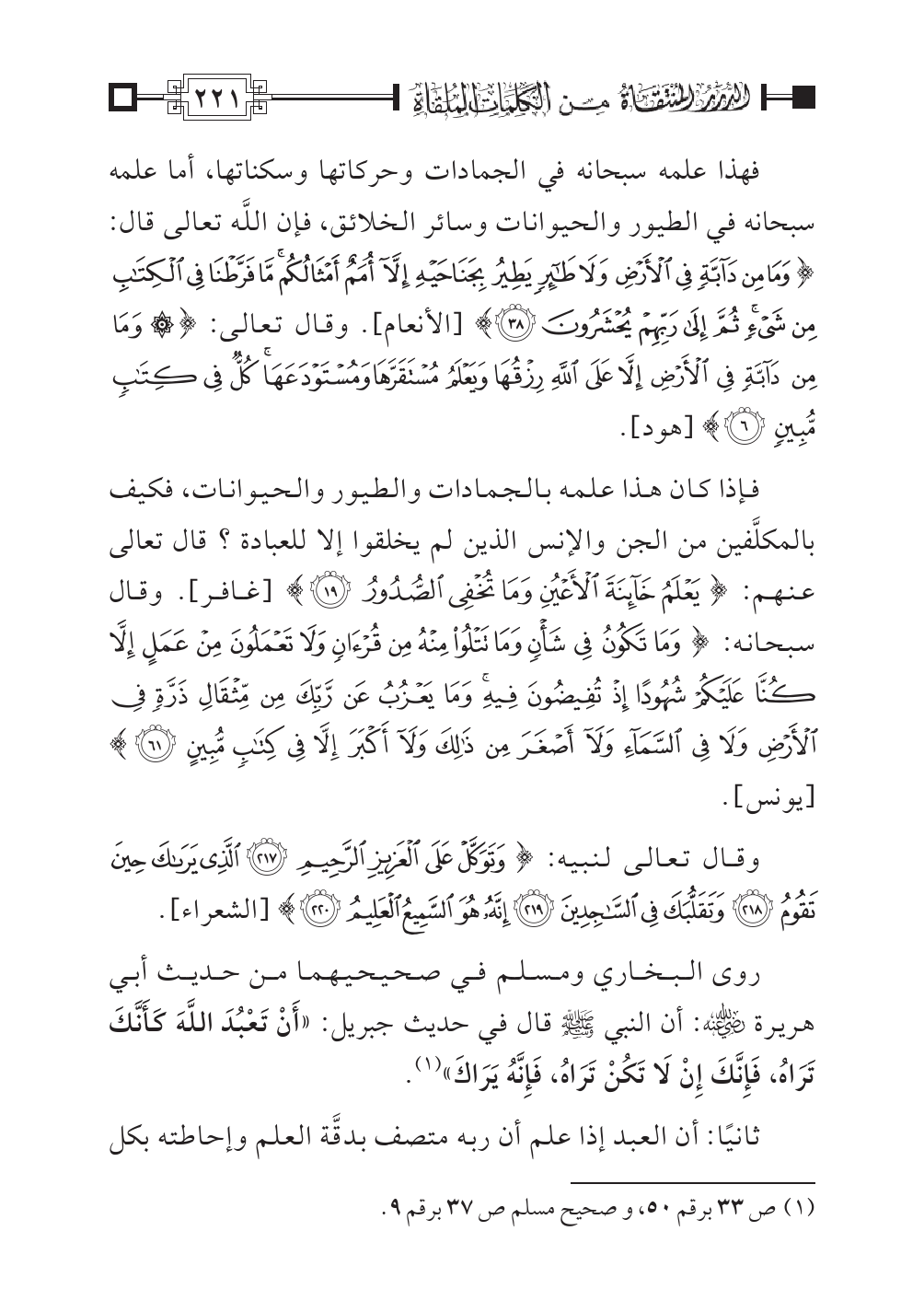 فهذا علمه سبحانه في الجمادات وحركاتها وسكناتها، أما علمه سبحانه في الطيور والحيوانات وسائر الخلائق، فإن اللَّه تعالى قال: {وَمَا مِن دَآبَّةٍ فِي الأَرْضِ وَلَا طَائِرٍ يَطِيرُ بِجَنَاحَيْهِ إِلَاّ أُمَمٌ أَمْثَالُكُم مَّا فَرَّطْنَا فِي الكِتَابِ مِن شَيْءٍ ثُمَّ إِلَى رَبِّهِمْ يُحْشَرُون (٣٨)} [الأنعام]. وقال تعالى: {وَمَا مِن دَآبَّةٍ فِي الأَرْضِ إِلَاّ عَلَى اللهِ رِزْقُهَا وَيَعْلَمُ مُسْتَقَرَّهَا وَمُسْتَوْدَعَهَا كُلٌّ فِي كِتَابٍ مُّبِين (٦)} [هود].