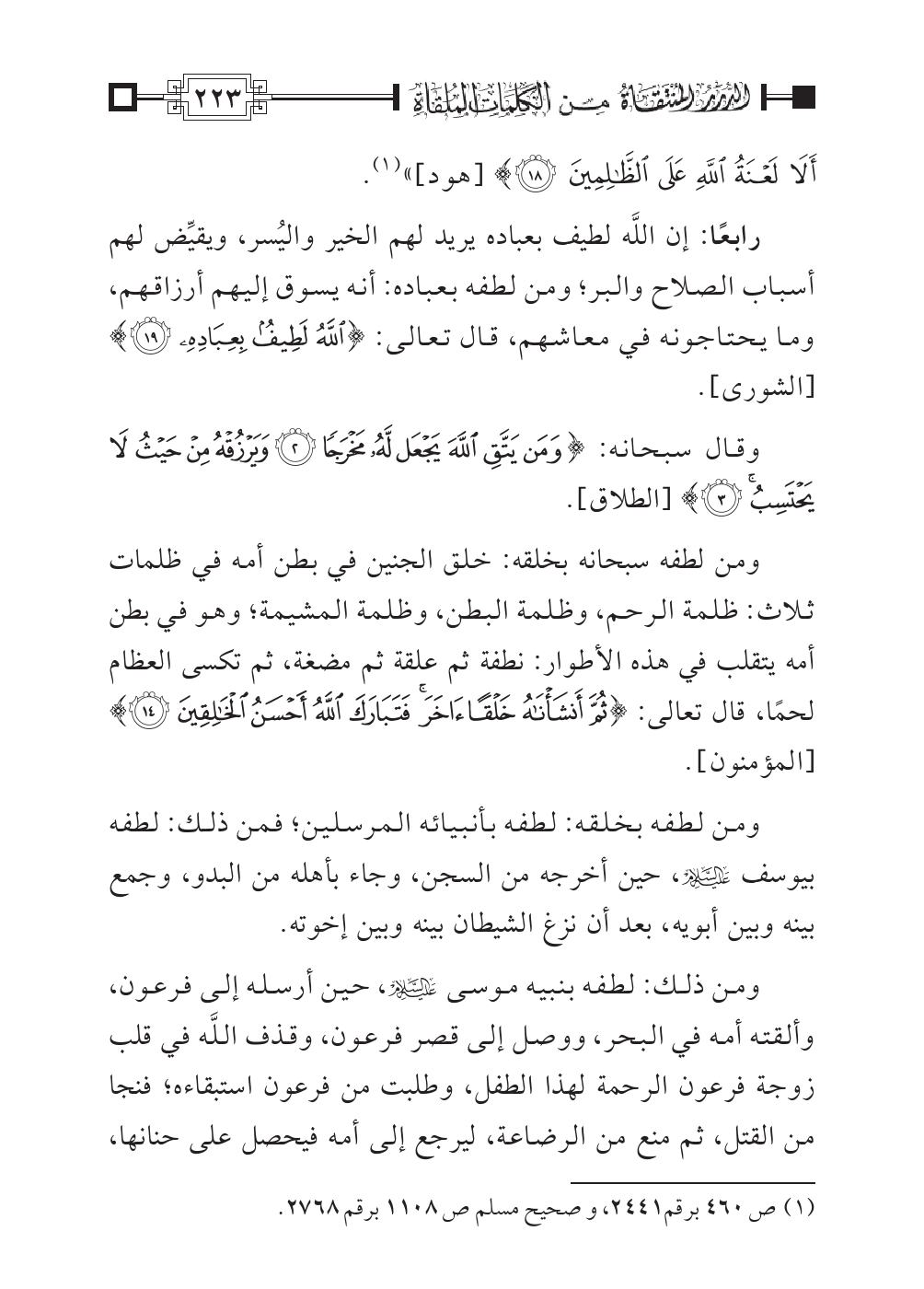 ومن ذلك: لطفه بنبيه موسى عليه السَّلام، حين أرسله إلى فرعون، وألقته أمه في البحر، ووصل إلى قصر فرعون، وقذف اللَّه في قلب زوجة فرعون الرحمة لهذا الطفل، وطلبت من فرعون استبقاءه؛ فنجا من القتل، ثم منع من الرضاعة، ليرجع إلى أمه فيحصل على حنانها،