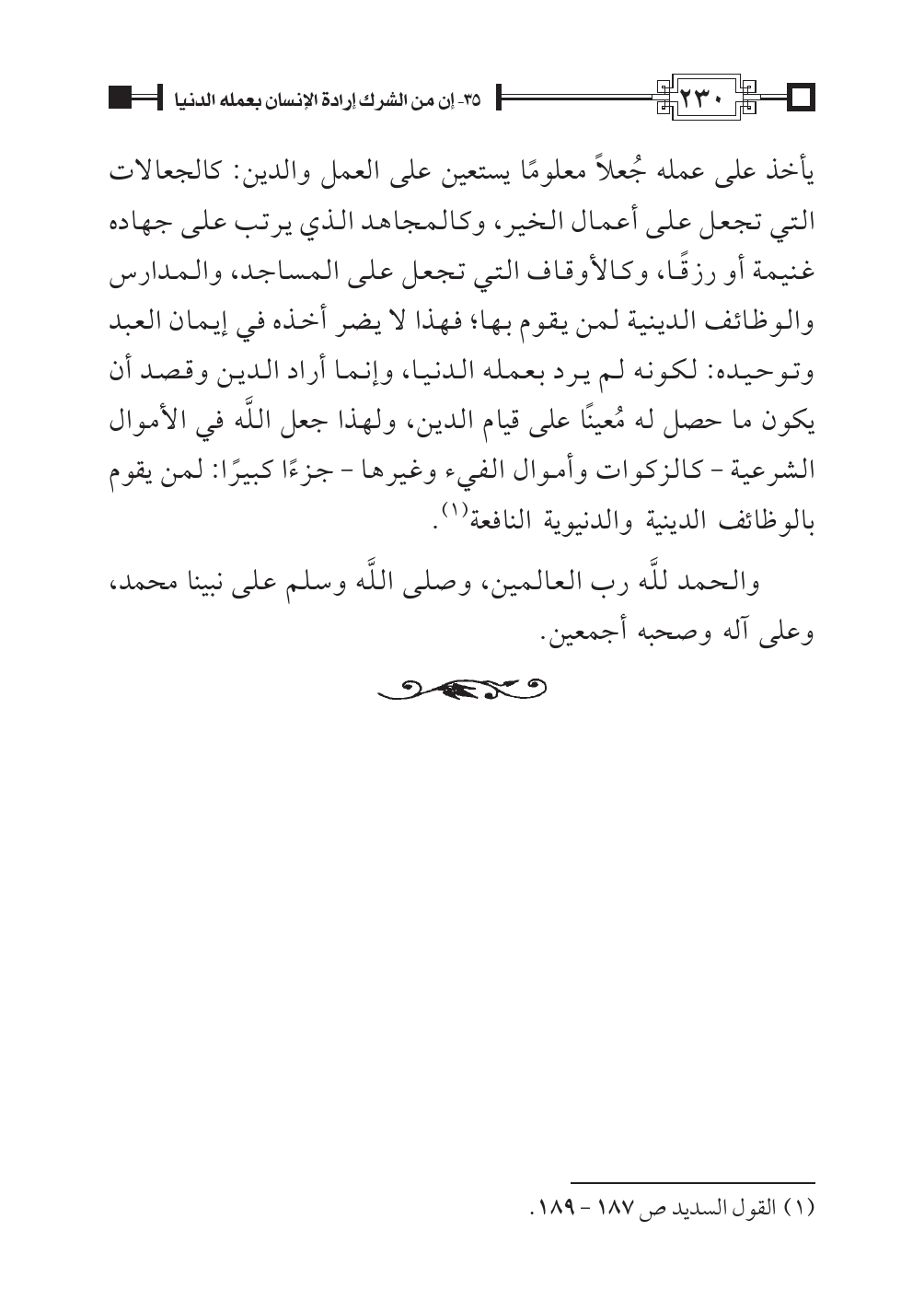 يأخذ على عمله جُعلاً معلومًا يستعين على العمل والدين: كالجعالات التي تجعل على أعمال الخير، وكالمجاهد الذي يرتب على جهاده غنيمة أو رزقًا، وكالأوقاف التي تجعل على المساجد، والمدارس والوظائف الدينية لمن يقوم بها؛ فهذا لا يضر أخذه في إيمان العبد وتوحيده: لكونه لم يرد بعمله الدنيا، وإنما أراد الدين وقصد أن يكون ما حصل له مُعينًا على قيام الدين، ولهذا جعل اللَّه في الأموال الشرعية - كالزكوات وأموال الفيء وغيرها - جزءًا كبيرًا: لمن يقوم بالوظائف الدينية والدنيوية النافعة (¬١).