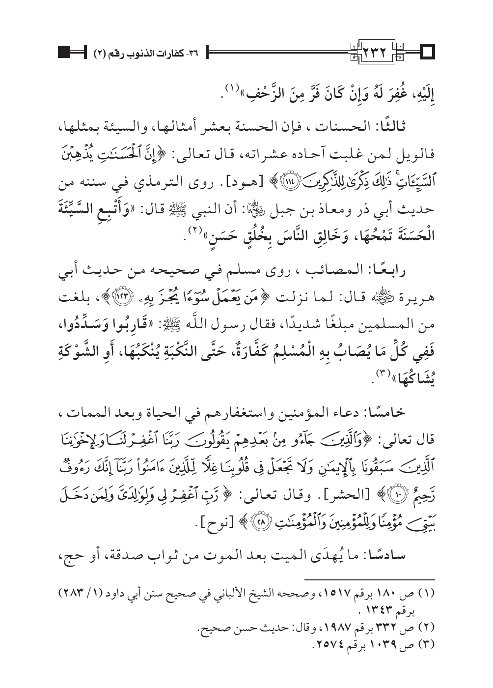 رابعًا: المصائب، روى مسلم في صحيحه من حديث أبي هريرة رضي اللهُ عنه قال: لما نزلت {مَن يَعْمَلْ سُوءًا يُجْزَ بِهِ} [النساء: ١٢٣]، بلغت من المسلمين مبلغًا شديدًا، فقال رسول اللَّه صلَّى اللهُ عليه وسلَّم: «قَارِبُوا وَسَدِّدُوا، فَفِي كُلِّ مَا يُصَابُ بِهِ الْمُسْلِمُ كَفَّارَةٌ، حَتَّى النَّكْبَةِ يُنْكَبُهَا، أَوِ الشَّوْكَةِ يُشَاكُهَا» (¬٣).