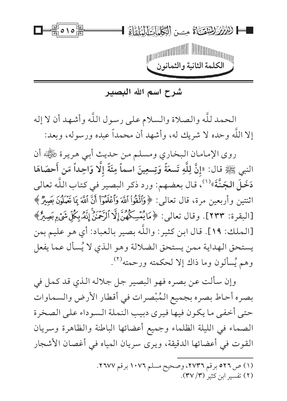 روى الإمامان البخاري ومسلم من حديث أبي هريرة رضي اللهُ عنه أن النبي صلَّى اللهُ عليه وسلَّم قال: «إِنَّ لِلَّهِ تَسعَةً وَتِسعِينَ اسماً مِئَةً إِلَّا وَاحِداً مَن أَحصَاهَا دَخَلَ الجَنَّةَ» (¬١)، قال بعضهم: ورد ذكر البصير في كتاب اللَّه تعالى اثنتين وأربعين مرة، قال تعالى: {وَاتَّقُوا اللهَ وَاعْلَمُوا أَنَّ اللهَ بِمَا تَعْمَلُونَ بَصِير (٢٣٣)} [البقرة]. وقال تعالى: {مَا يُمْسِكُهُنَّ إِلَاّ الرَّحْمَنُ إِنَّهُ بِكُلِّ شَيْءٍ بَصِير (١٩)} [الملك]. قال ابن كثير: واللَّه بصير بالعباد: أي هو عليم بمن يستحق الهداية ممن يستحق الضلالة وهو الذي لا يُسأل عما يفعل وهم يُسألون وما ذاك إلا لحكمته ورحمته (¬٢).