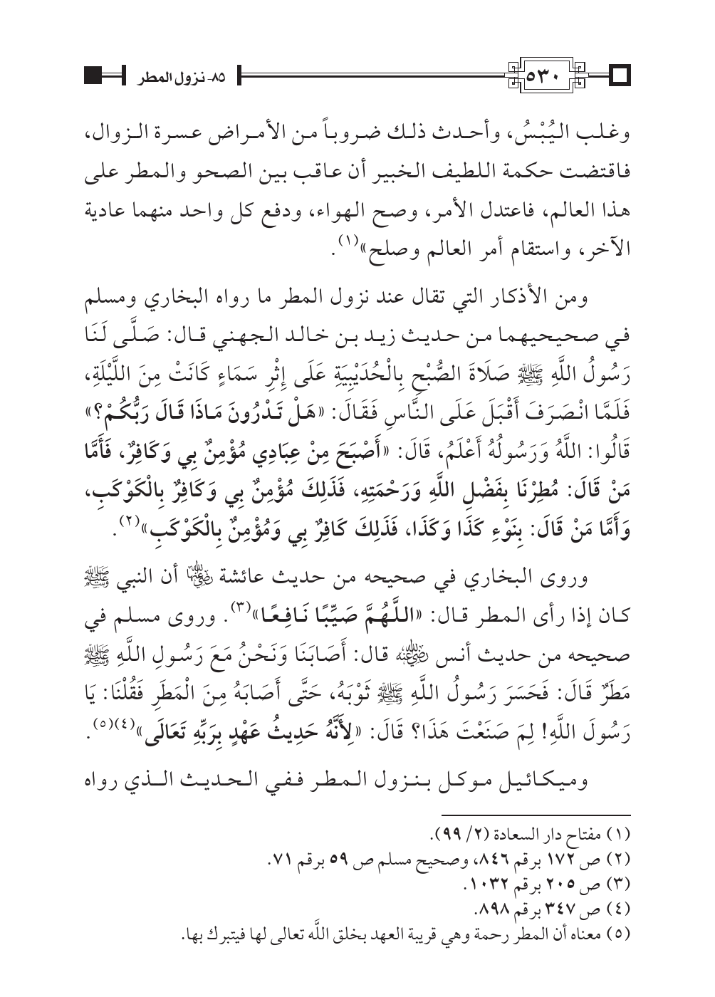 ومن الأذكار التي تقال عند نزول المطر ما رواه البخاري ومسلم في صحيحيهما من حديث زيد بن خالد الجهني قال: صَلَّى لَنَا رَسُولُ اللَّهِ صلَّى اللهُ عليه وسلَّم صَلَاةَ الصُّبْحِ بِالْحُدَيْبِيَةِ عَلَى إِثْرِ سَمَاءٍ كَانَتْ مِنَ اللَّيْلَةِ، فَلَمَّا انْصَرَفَ أَقْبَلَ عَلَى النَّاسِ فَقَالَ: «هَلْ تَدْرُونَ مَاذَا قَالَ رَبُّكُمْ؟ » قَالُوا: اللَّهُ وَرَسُولُهُ أَعْلَمُ، قَالَ: «أَصْبَحَ مِنْ عِبَادِي مُؤْمِنٌ بِي وَكَافِرٌ، فَأَمَّا مَنْ قَالَ: مُطِرْنَا بِفَضْلِ اللَّهِ وَرَحْمَتِهِ، فَذَلِكَ مُؤْمِنٌ بِي وَكَافِرٌ بِالْكَوْكَبِ، وَأَمَّا مَنْ قَالَ: بِنَوْءِ كَذَا وَكَذَا، فَذَلِكَ كَافِرٌ بِي وَمُؤْمِنٌ بِالْكَوْكَبِ» (¬٢).