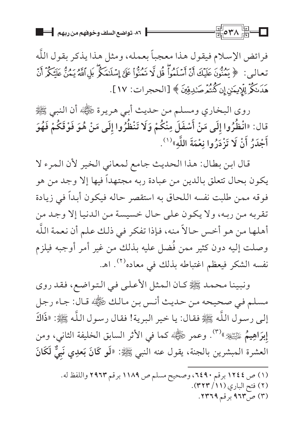 قال ابن بطال: هذا الحديث جامع لمعاني الخير لأن المرء لا يكون بحال تتعلق بالدين من عبادة ربه مجتهداً فيها إلا وجد من هو فوقه ممن طلبت نفسه اللحاق به استقصر حاله فيكون أبداً في زيادة تقربه من ربه، ولا يكون على حال خسيسة من الدنيا إلا وجد من أهلها من هو أخس حالاً منه، فإذا تفكر في ذلك علم أن نعمة اللَّه وصلت إليه دون كثير ممن فُضل عليه بذلك من غير أمر أوجبه فيلزم نفسه الشكر فيعظم اغتباطه بذلك في معاده (¬٢). اهـ.